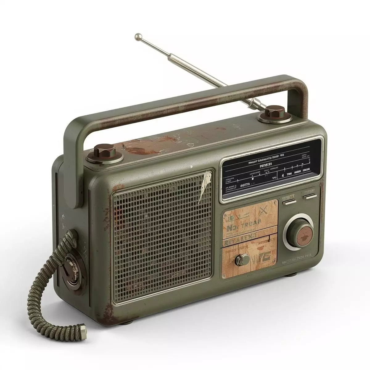 Tags3d model survival radio military green weathered metal game ready prop post-apocalyptic gear taped battery wire antenna field radio industrial wear analog dial realistic rust isolated asset pbr materials communication prop survival gear digital sculpture
