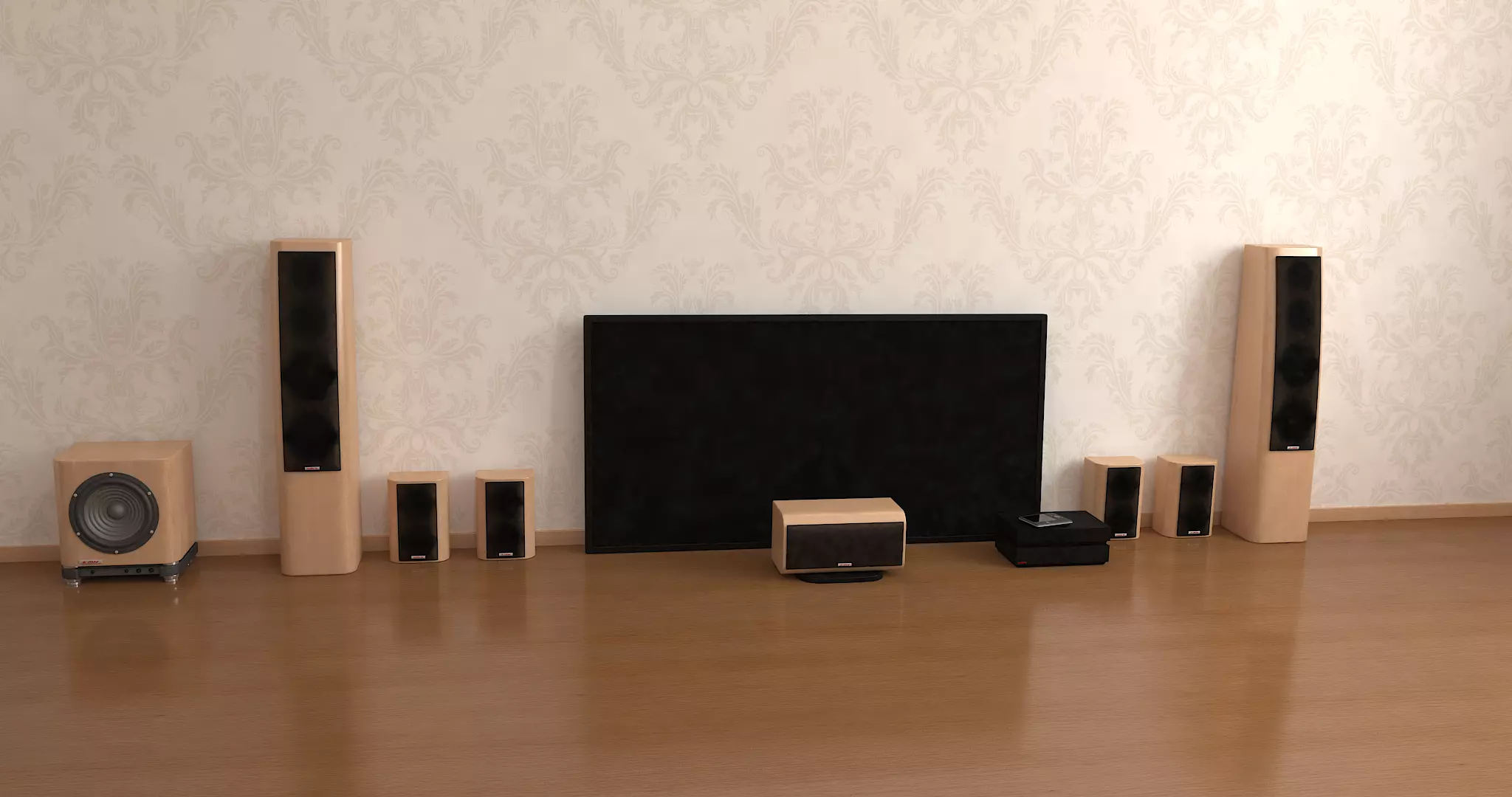 Set includes:60" flat screen TVLeft and right floor main speakersCenter speakerLeft and right wall front speakersLeft and right wall back speakersFloor subwooferSmart remote controlMaterials and textures.