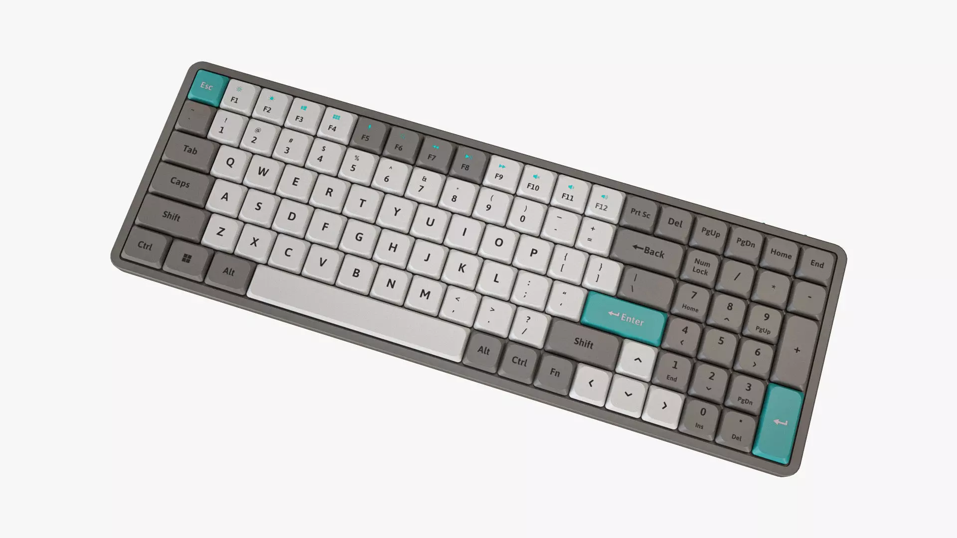 Detailed 3D model of a grey 1800 Compact Computer Keyboard, modeled in Cinema 4D and rendered with V-Ray 5. The model was created using approximate real world dimensions.