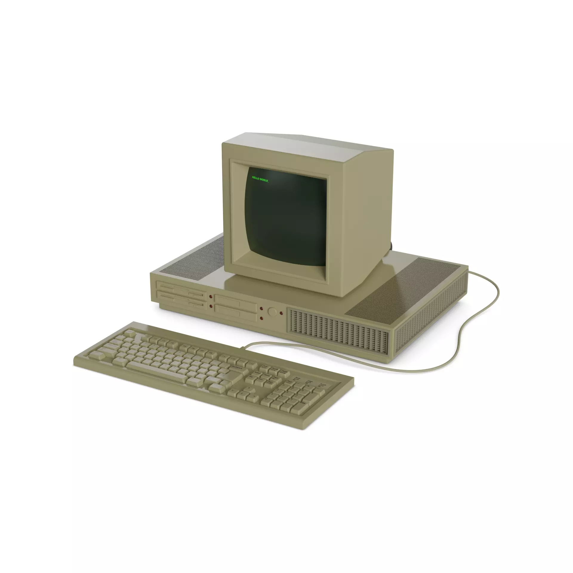 A bulky desktop computer from the 80s with a beige plastic casing, a large CRT monitor displaying green text, and a mechanical keyboard with loud clicky keys.