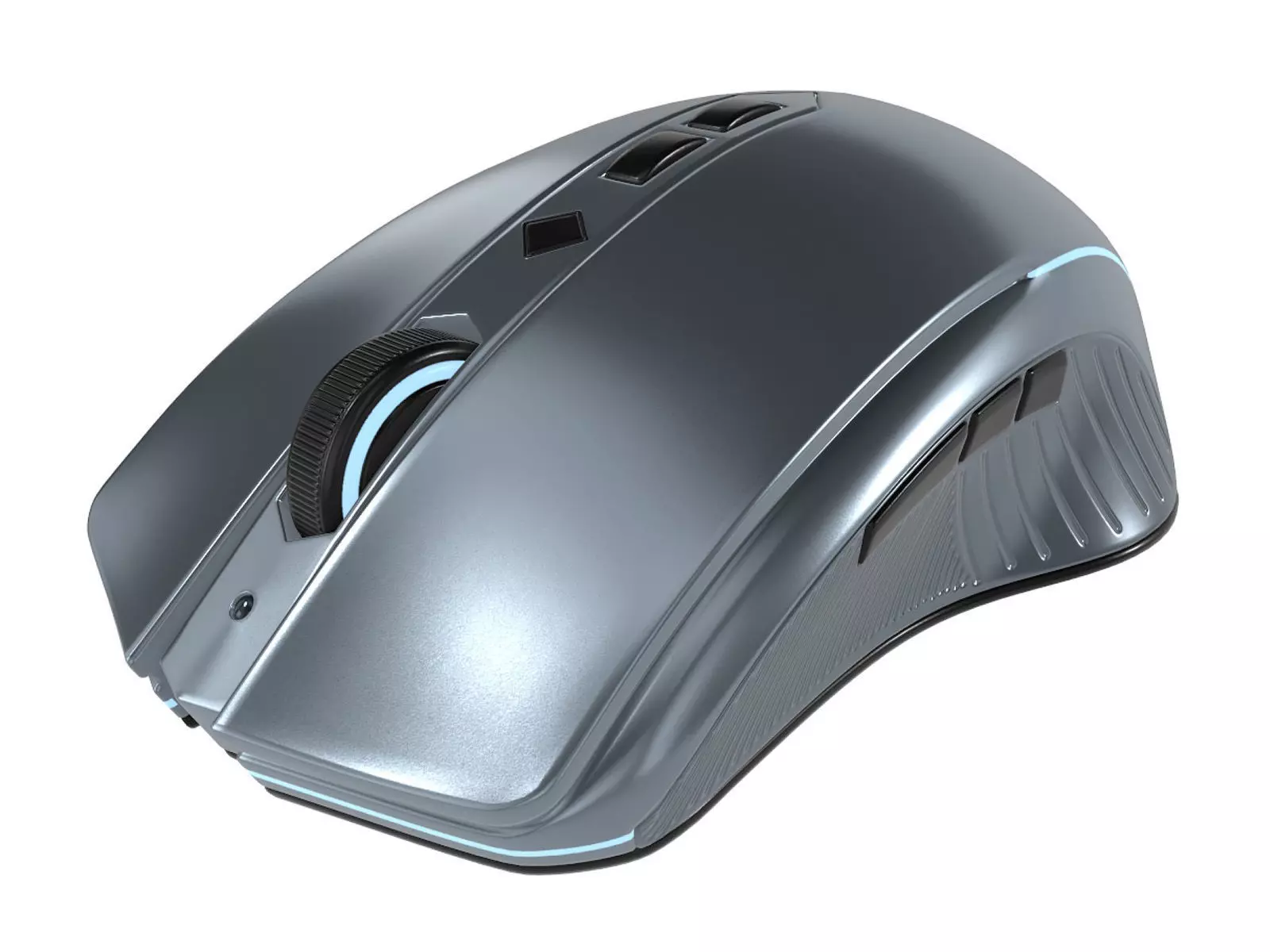 A futuristic silver and blue gaming mouse with a metallic finish, equipped with advanced tracking technology and customizable buttons, offering both style and functionality for gamers in the current timeline.