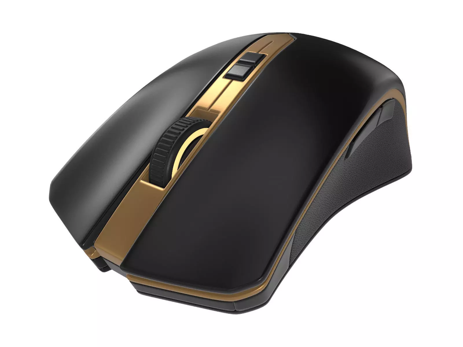 A premium black and gold gaming mouse with a sleek matte finish, featuring customizable RGB lighting and a high precision sensor, delivering top-tier performance and style for gamers in the current timeline.