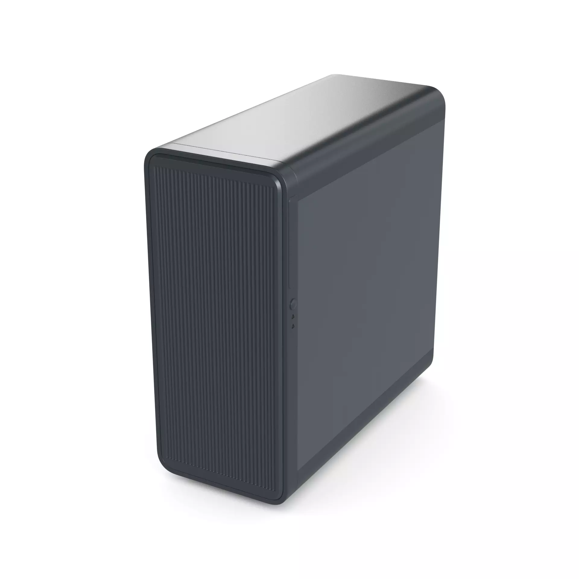 A desktop PC in a matte gray color, exuding a sense of understated elegance. The tower is sleek and streamlined, with a brushed metal finish that is both durable and stylish.