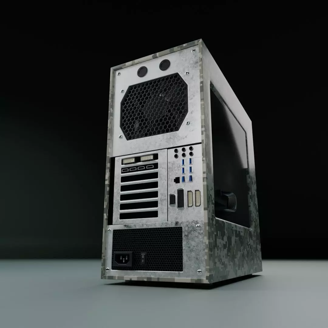 This detailed 3D model of a rugged desktop PC tower features a weathered metal casing with digital camouflage accents, rear I/O ports, ventilation mesh, and internal cable detail. Perfect for military tech scenes, post-apocalyptic environments, or custom rig visualizations. Built with clean geometry for optimized performance and high realism in both real-time and rendered applications.