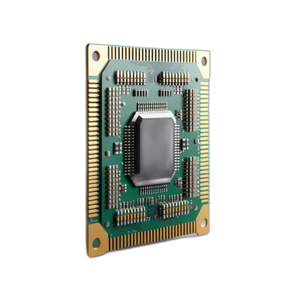 This is a meticulously crafted 3D model of an electronic circuit board module, designed with high fidelity to represent a typical computer or industrial electronic component. The model showcases a vibrant green Printed Circuit Board (PCB) densely populated with a variety of surface-mounted devices, including integrated circuits (ICs), resistors, capacitors, and a prominent central chip package. Its edges feature realistic gold-plated contacts, adding to its authentic appearance. This versatile asset is perfect for a wide range of applications, from enhancing virtual environments in game development, especially for futuristic or industrial settings, to providing realistic props for architectural visualizations of data centers, offices, or technology labs. It is also well-suited for augmented reality (AR) experiences, detailed digital art compositions, product renderings, and educational simulations. The model boasts clean, optimized topology, ensuring smooth performance in real-time applications while also being suitable for high-resolution static renderings. It comes fully UV unwrapped with PBR (Physically Based Rendering) textures, providing a consistent and realistic material representation across different rendering engines. Supported file formats include GLB, OBJ, FBX, USD, DAE, ABC, and PLY, ensuring broad compatibility. Whether you need a detailed component for close-up shots or an optimized asset for large-scale scenes, this circuit board module is ready to integrate into your projects.