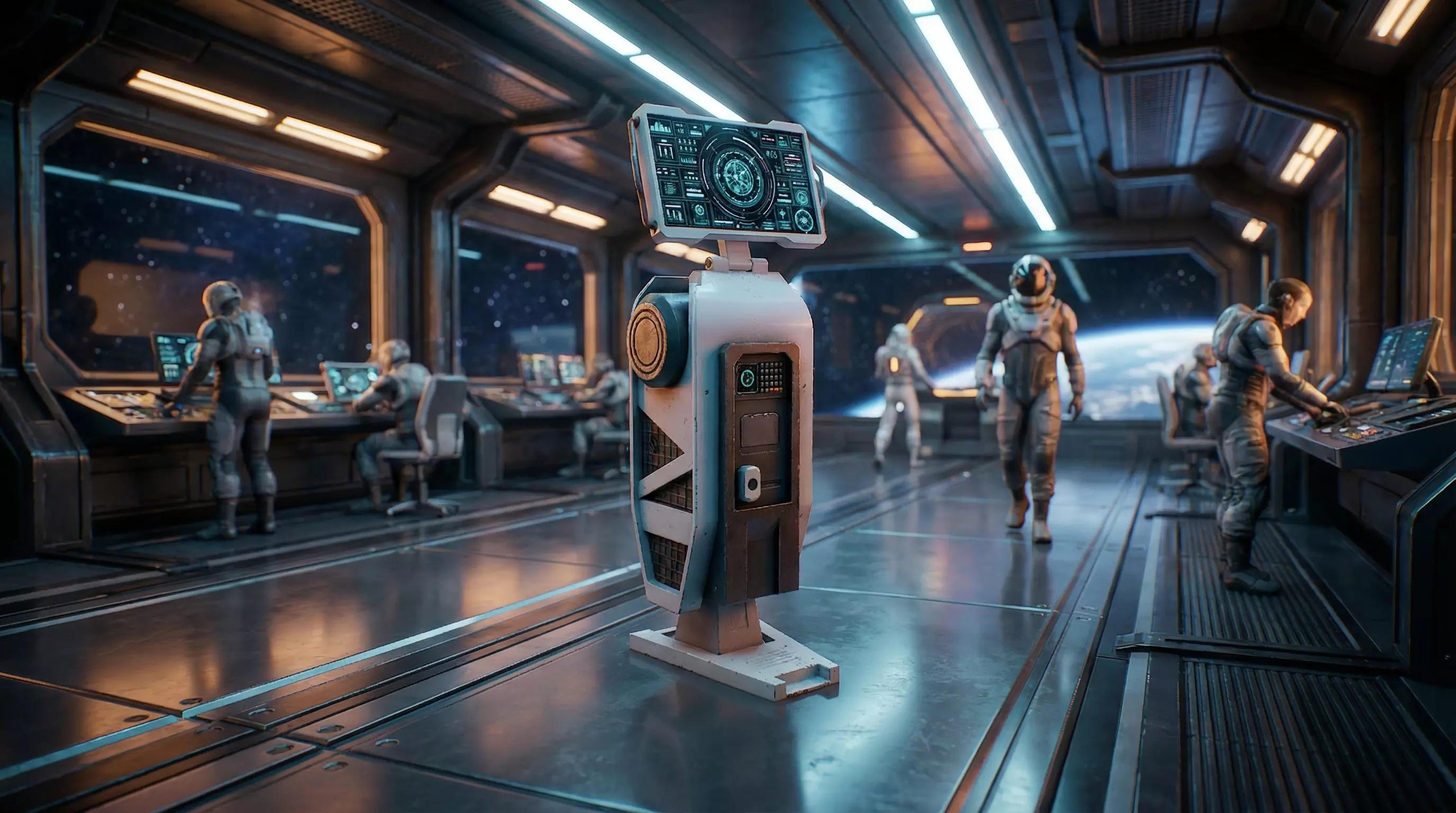Futuristic sci-fi terminal consists of a rectangular base supporting a vertical structure with various components. At the top, there is a screen or tablet displaying a digital interface with complex graphics and data, resembling a control panel or a heads-up display. The main body of the device is predominantly white with some black and gray accents, featuring vents, panels, and a circular element on the side that might be a sensor or camera. The design is sleek, industrial, and sci-fi in style, suggesting that this could be a piece of advanced technology used for communication, security, or control purposes.