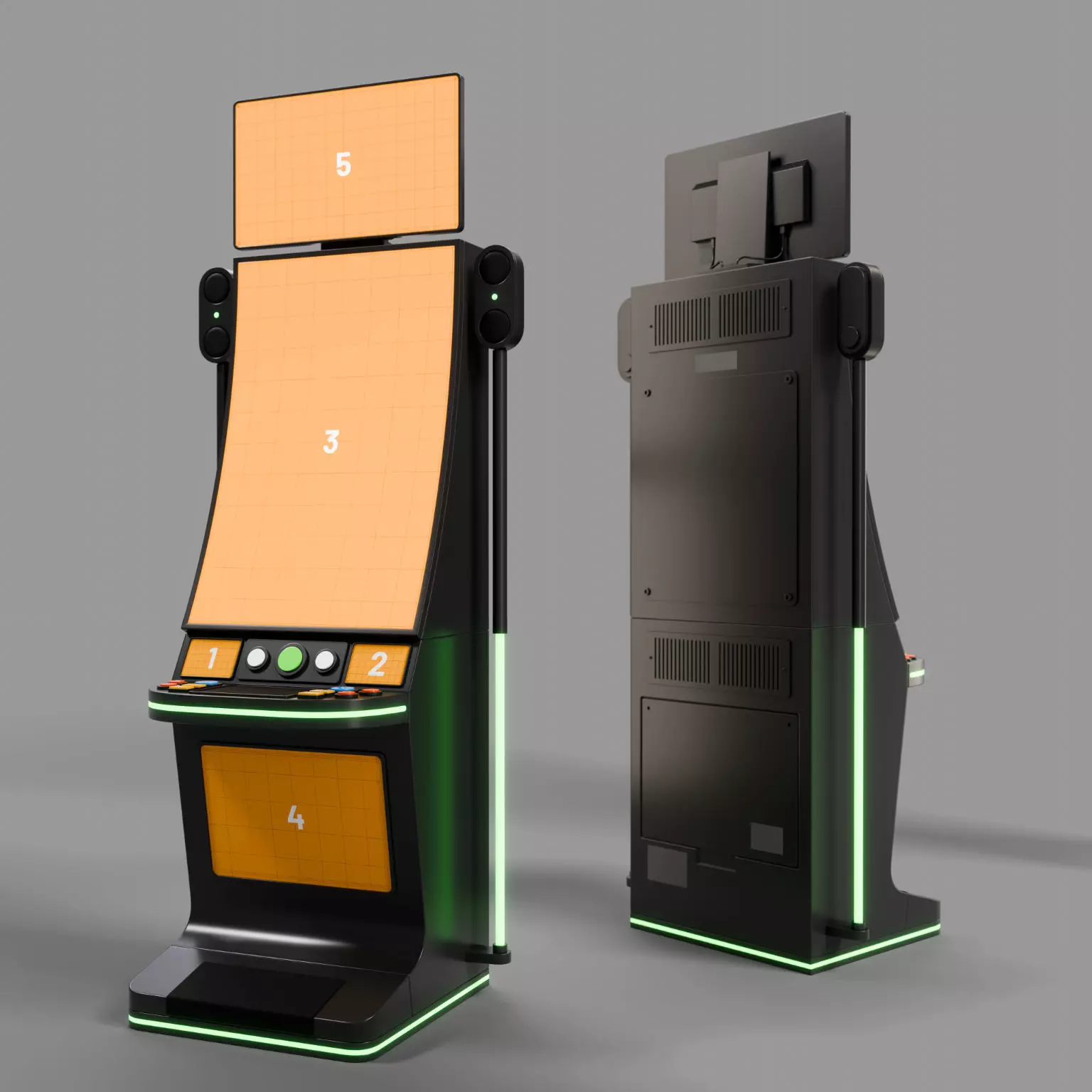 *A modern slot machine 3D model featuring a curved screen and five areas for you to customise. *Materials are easy to adjust to your liking - the provided textures show you where you can place your images for the screens and other potential advertising areas. The model is provided with a clean, grid-like topology, allowing you to add deformers - for example, for squash, stretch, bend or twist animations. Any unwanted parts can be removed by selecting the polygon island - I've purposely not merged vertices across individual parts to allow that flexibility.