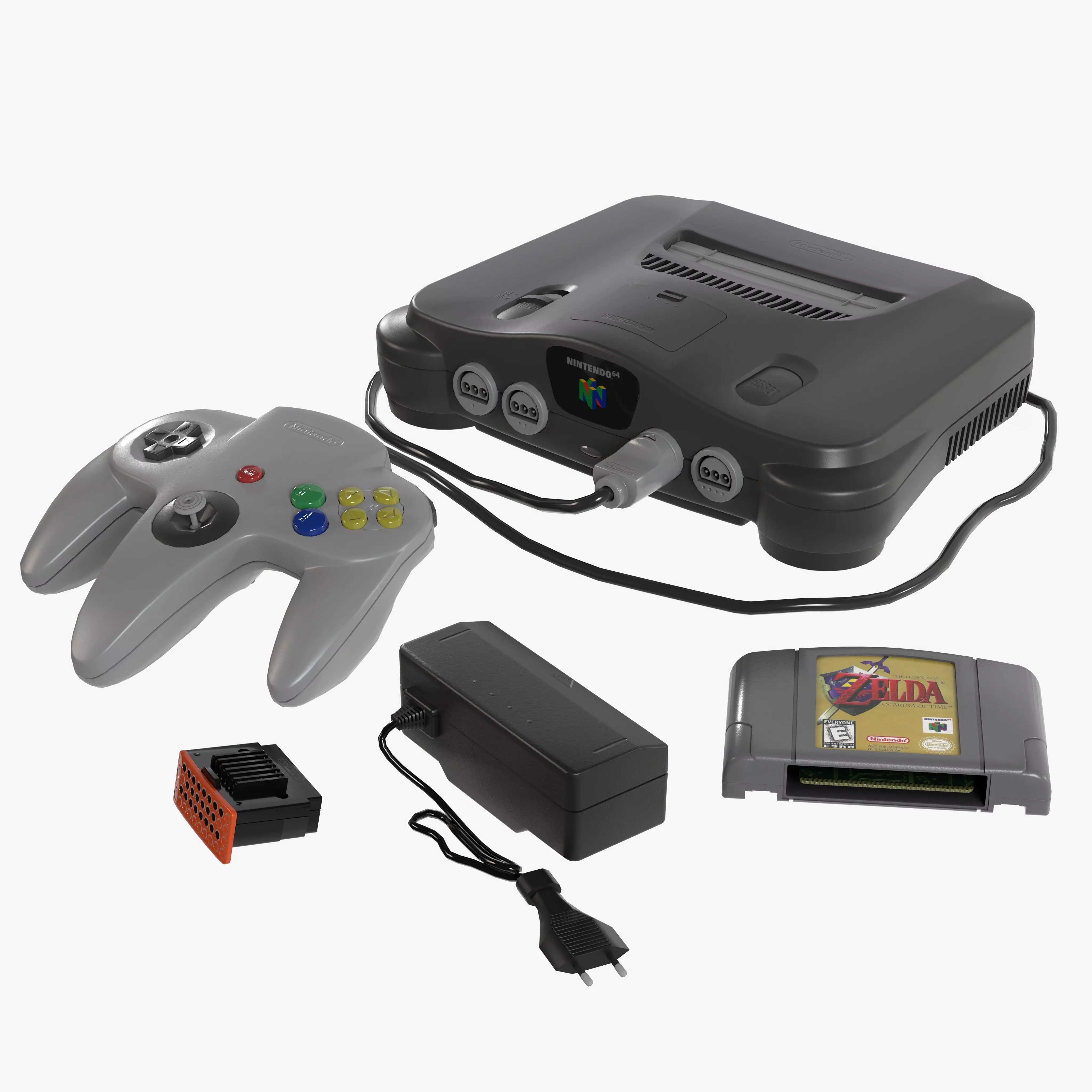 3D model of the Nintendo 64 console and peripherals.