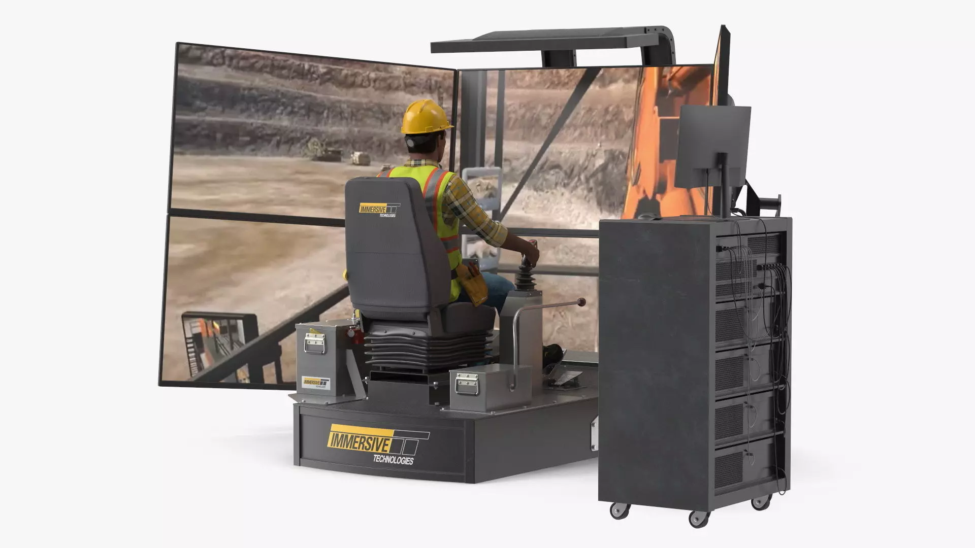 Operator on LX6 Mining Machine Simulator is a 3d model of a heavy machinery operator seated in a mining machine simulator, designed to replicate the experience of controlling an LX6 mining vehicle in a training environment.