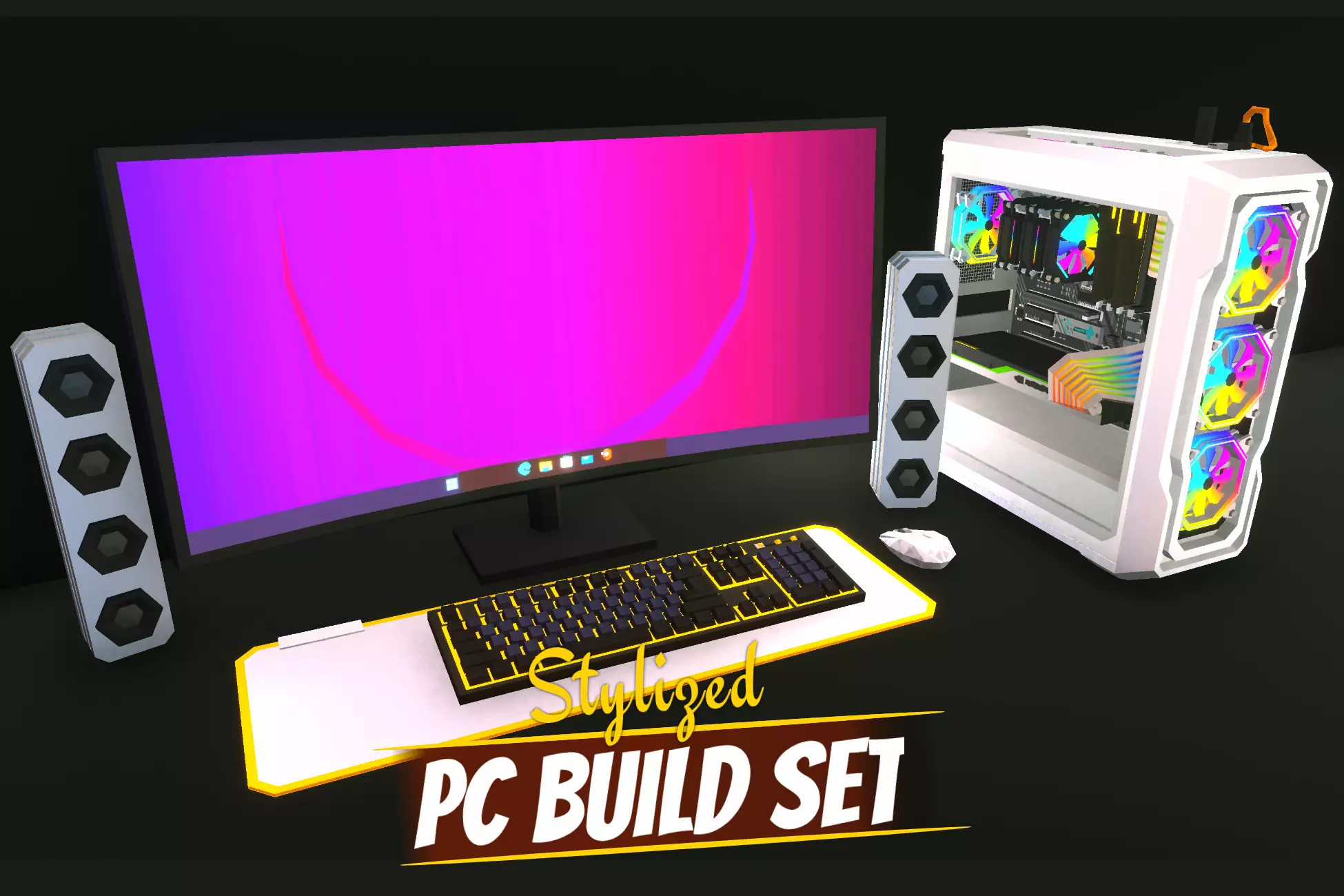 The set of assets includes:Old keyboard, old mouse, old monitor, horizontal system unit, disk, floppy disk, flash drive, mouse (x12), hole for wires, keyboard (x4), usb cable (x2), gaming surface (x3), mouse pad (x4), processor, RAM (x8), box with processor (x3), processor holder, thermal paste, spatula, monitor (x6), bracket (x2), screwdriver, floppy disk drive, hard disk (x4), external disk (x3), cable (x2), usb cable, cooler (x10), motherboard (x12), processor cooling (x7), processor cooling cap (x6), power supply (x4), video card (x16), screw, napkin, napkin holder, floppy disk port, computer case (x25), usb cable (x5), signal amplifier, dark water pipes (x3), hard drive cable (x7), power supply cable (x3), Water Cooling (x8), Power Cable (x2), Mouse Cable, Keyboard Cable, Light Cable (x5), Speaker (x12), Speaker Wire, Lamp (x3).