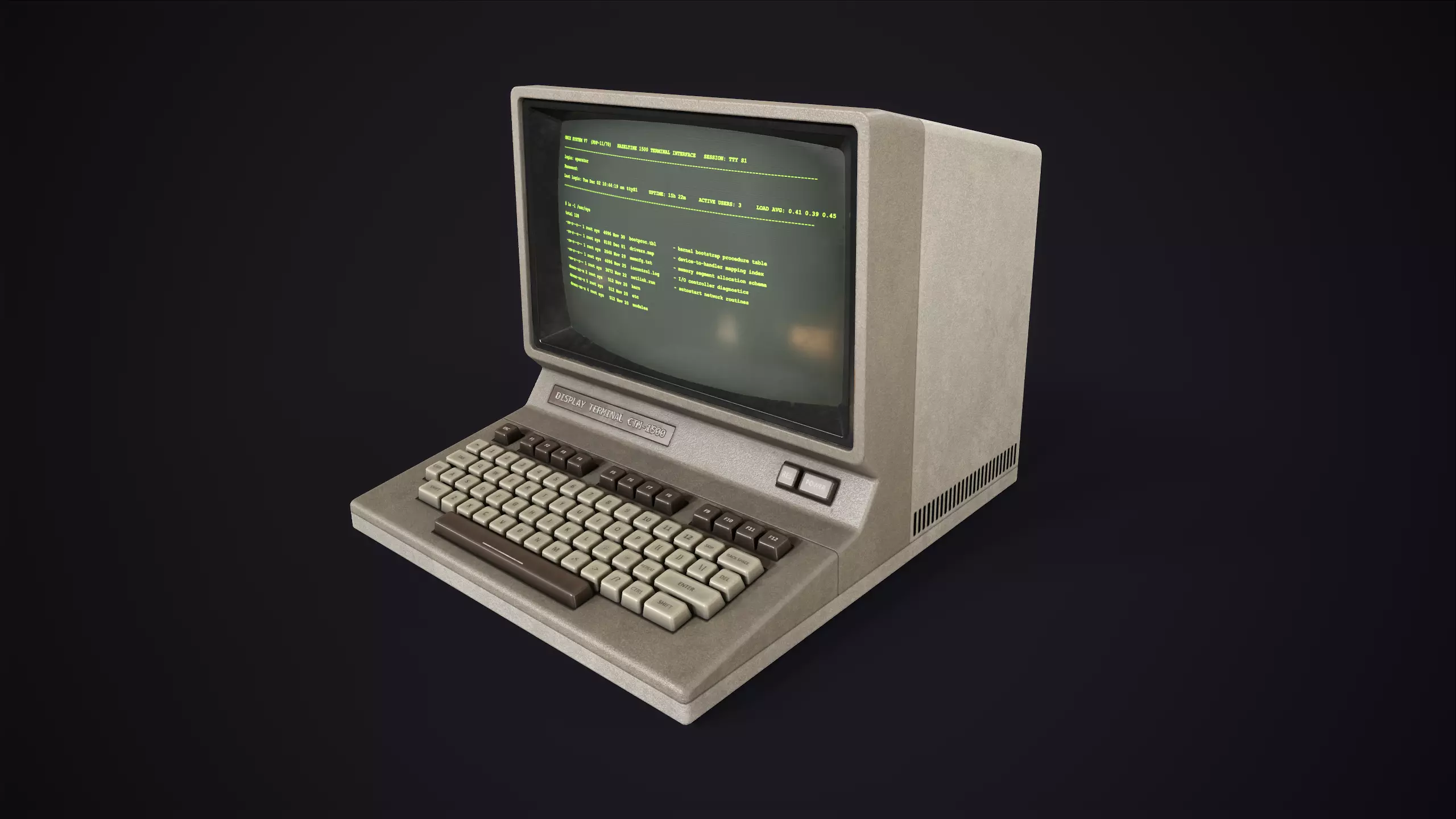 Integrated keyboard and CRT monitor. 1970s–1980s aesthetic.