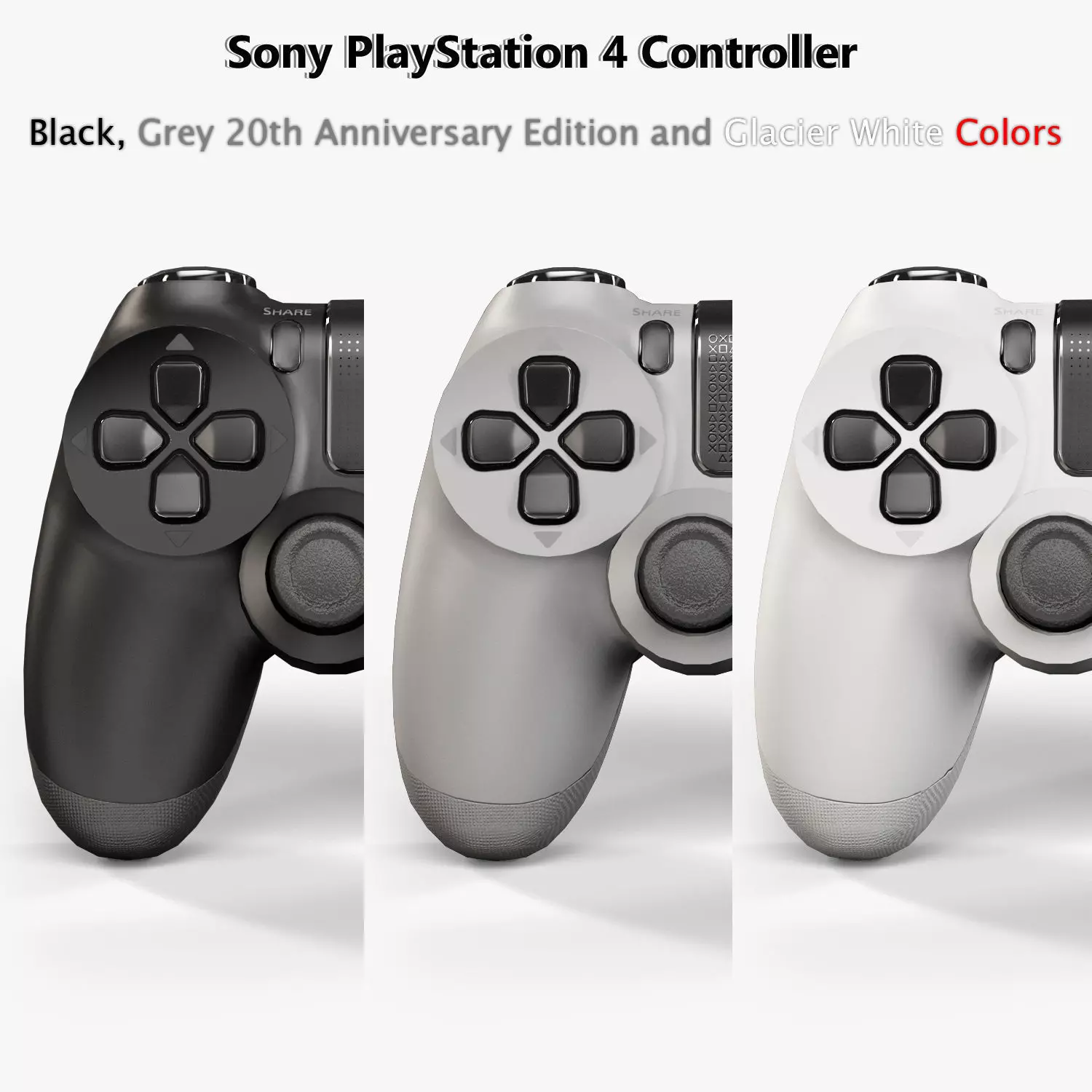• Let me present to you high-quality low-poly 3D model Sony PlayStation 4 Game Controller. This model can be used in various fields 3D Graphics such as game development, advertising, interior design, motion picture art, visualization, etc... Model is presented in three colors: Black, Glacier White and Grey 20th Anniversary Edition. Modeling was made with ortho-photos of real controller that is why all details of design are recreated most authentically.
