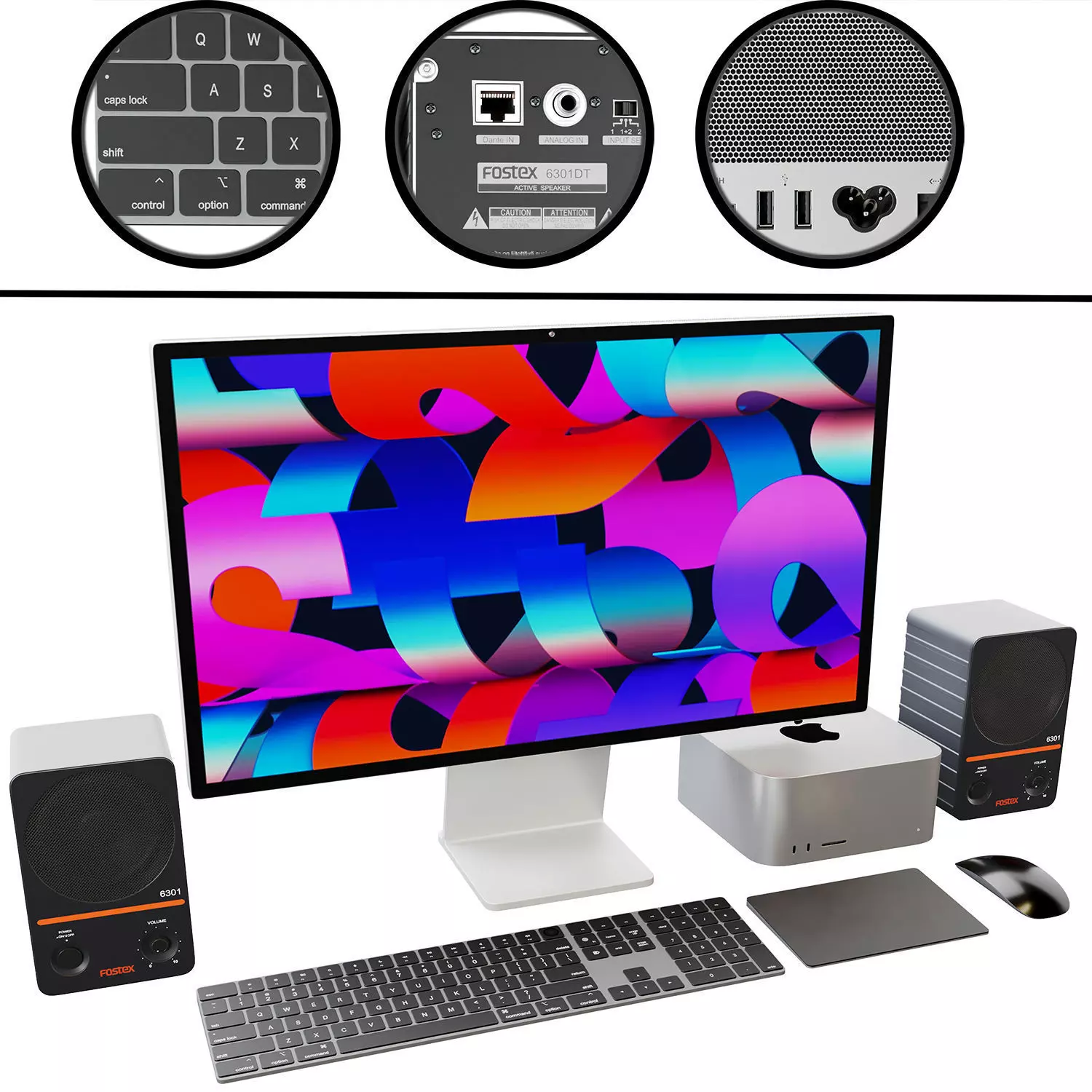 1)Mac Studio 20222)Studio Display 20223)Magic Keyboard with Touch ID4)Magic Trackpad5)Magic Mouse6) FOSTEX Dante version 6301DT
