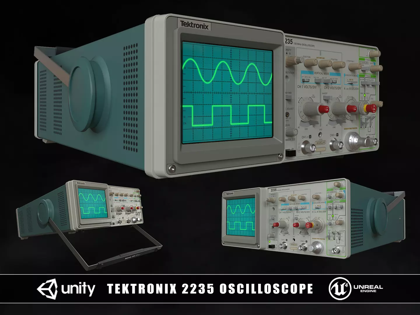Tektronix 2235 Oscilloscope 3D model. This model comes with an oscilloscope with powered ON and powered OFF textures. Modeled in Maya and textured with Substance Painter and Photoshop. The model is built to scale and is UV unwrapped with 4k Textures. Includes 3D model and textures!