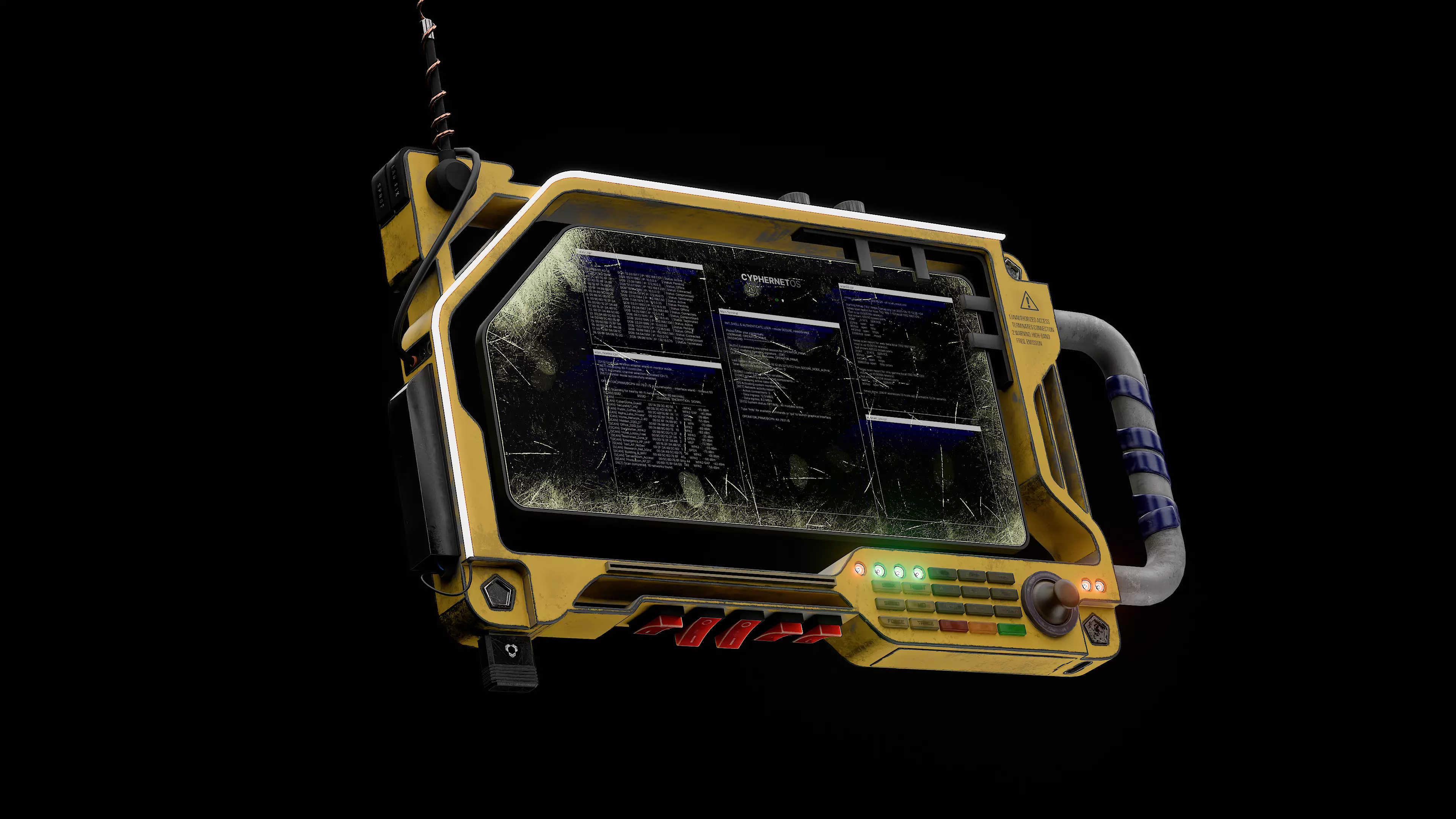 Hyper-Realistic Texturing: Features meticulous details including screen fingerprints, dust accumulation, edge wear, and industrial grunge, making it perfect for close-up renders and cinematics.Unique Design: A blend of retro-futuristic aesthetics with tactical inputs—toggle switches, a heavy-duty trackball, and a reinforced yellow casing.Immersive Interface: The screen displays a custom code/terminal interface (Cyphernet OS), adding instant depth to your scene without needing extra UI work.Versatile Use: Ideal for FPS games, VR experiences, inventory screens, or as a hero prop in high-quality animations.