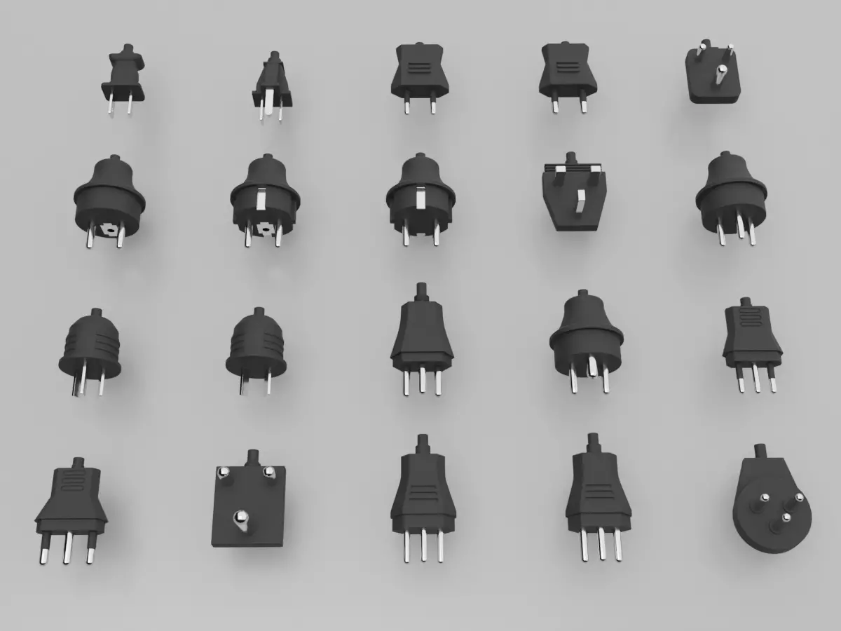 Blender file contains 20 models of plugs: Type A, Type B, type C with 4mm pins, Type C with 4.8mm pins, Type D, Type E, Type F, Type E/F Combo, Type G, Type H, Type I earthed, Type I with no earth pin, Type J, Type K, Type L for 10 amps, Type L for 16 amps, Type M, Type N for 10amps, Type N for 20 amps and Type O.