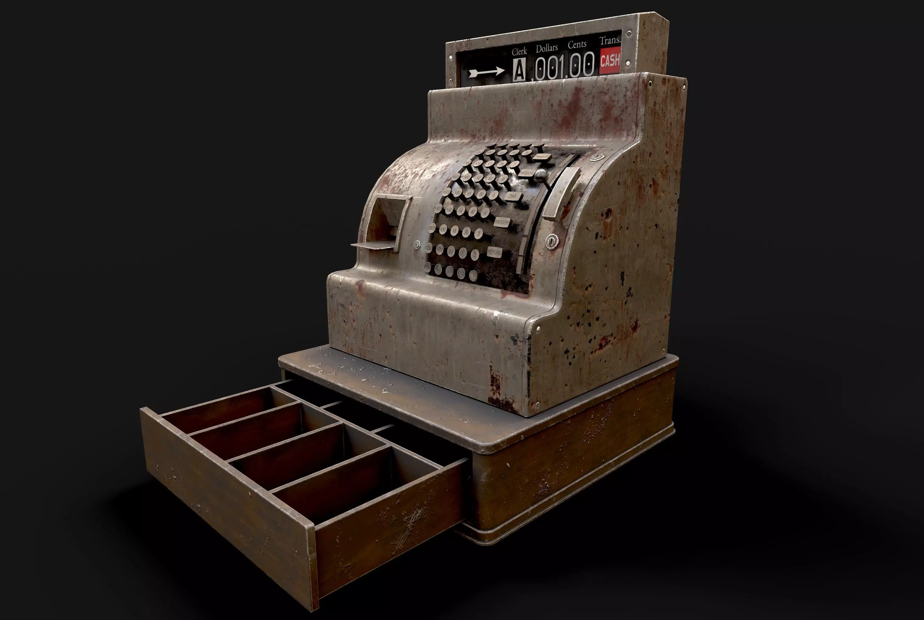 The model features a classic mechanical design with detailed keys, display panel, and an open cash drawer with individual compartments. Special attention has been given to surface imperfections and material breakup to achieve a believable aged and industrial appearance suitable for close-up shots.