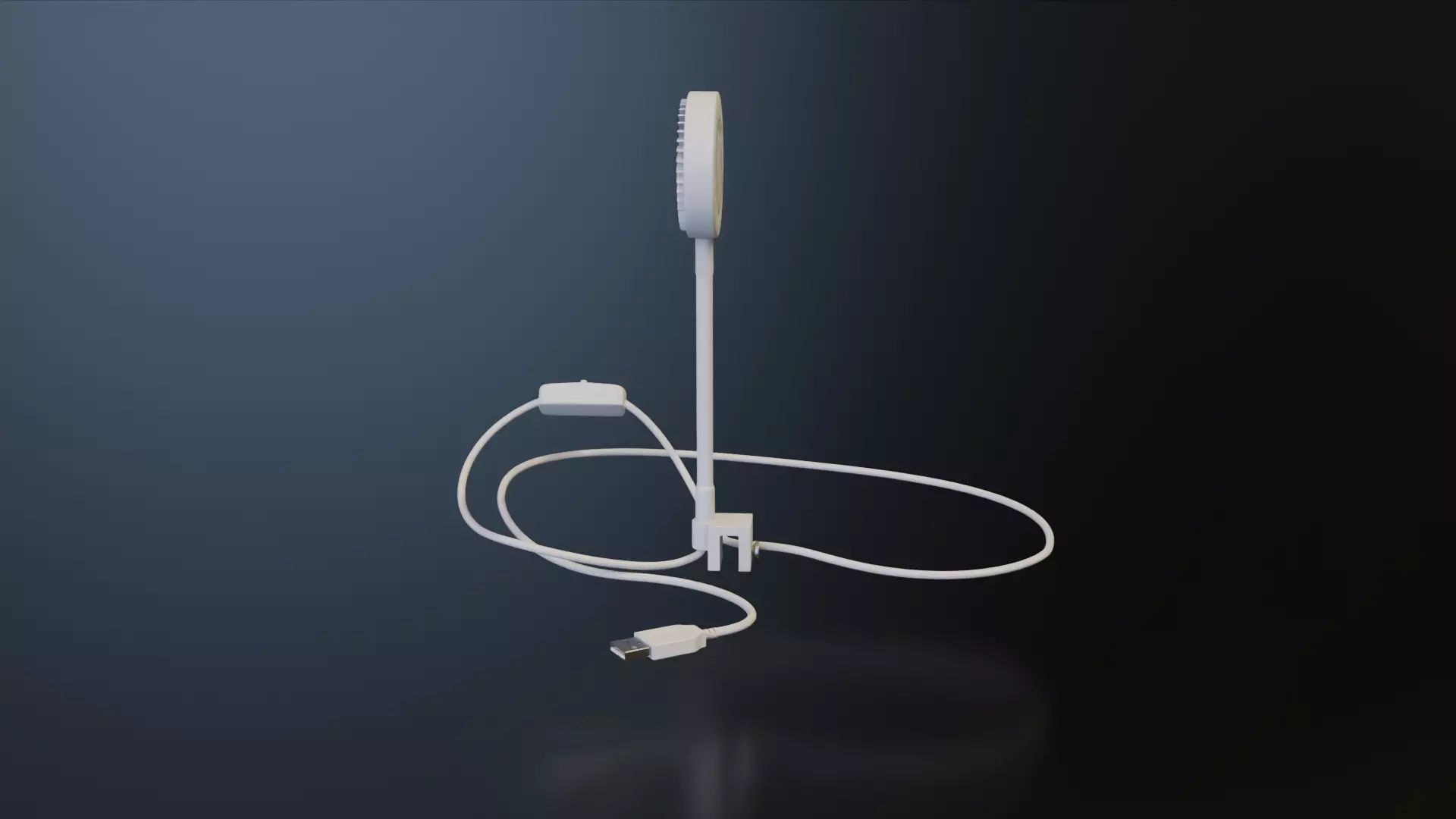 This is a clean and minimalist USB-powered desk fan 3D model, designed with a modern aesthetic. The fan features a circular grille head, slim vertical stand, and a small clip-style base, making it suitable for desk, bedside, or workstation use. A USB cable with inline switch is included, adding realism and functional detail to the model.