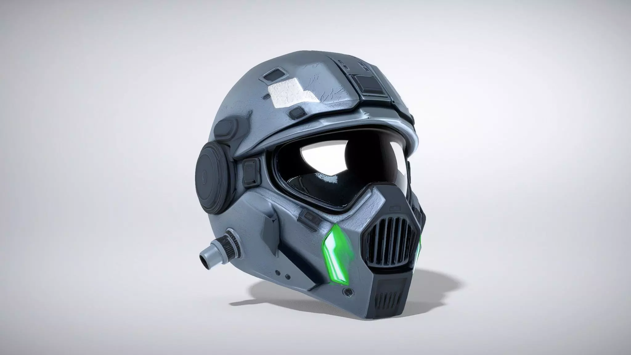 This futuristic cyber helmet showcases an asymmetric design with a large cyclops night vision lens, thick armored brow, and a vented respirator mouth grille. Ideal for sci-fi environments, it features micro cameras and neon green edge lighting, making it perfect for high-quality visual models. Each model has 3 levels of detail with QUAD polygons: