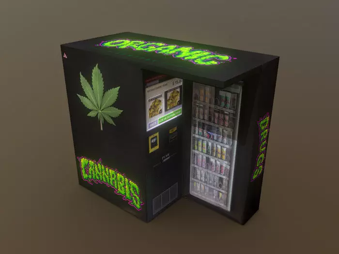 Highly detailed Cannabis Vending Machine 3D model designed for realistic renders, games, and virtual environments. This model represents a modern automated dispensary machine with integrated digital screen, product display window, payment panel, and illuminated branding elements. The machine features a detailed interior product layout visible through the glass door, along with realistic exterior materials and cannabis-themed graphics for an authentic dispensary appearance.