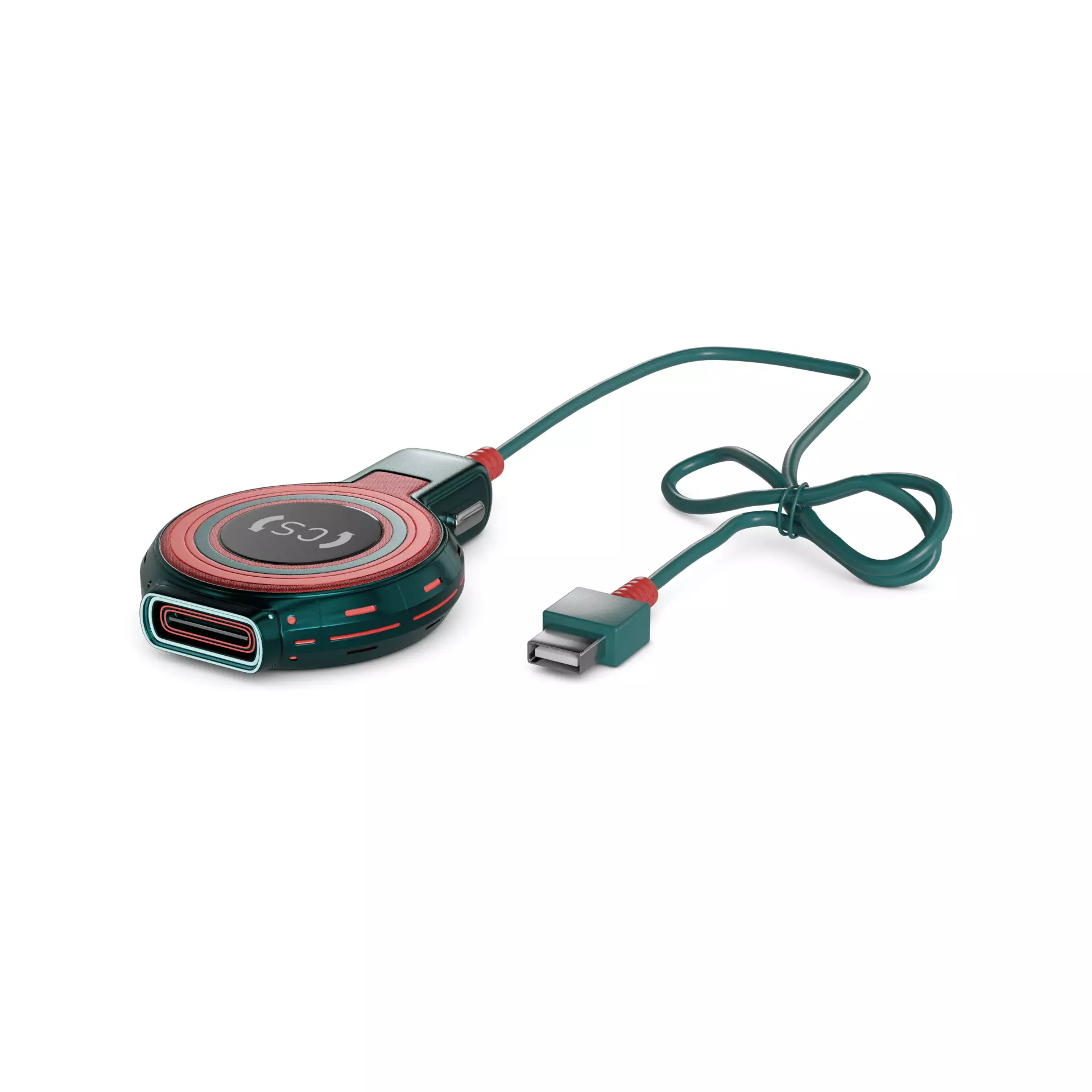 A futuristic red car charger with wireless charging capabilities, adorned with LED lights that indicate charging status, ideal for modern vehicles in the current timeline.