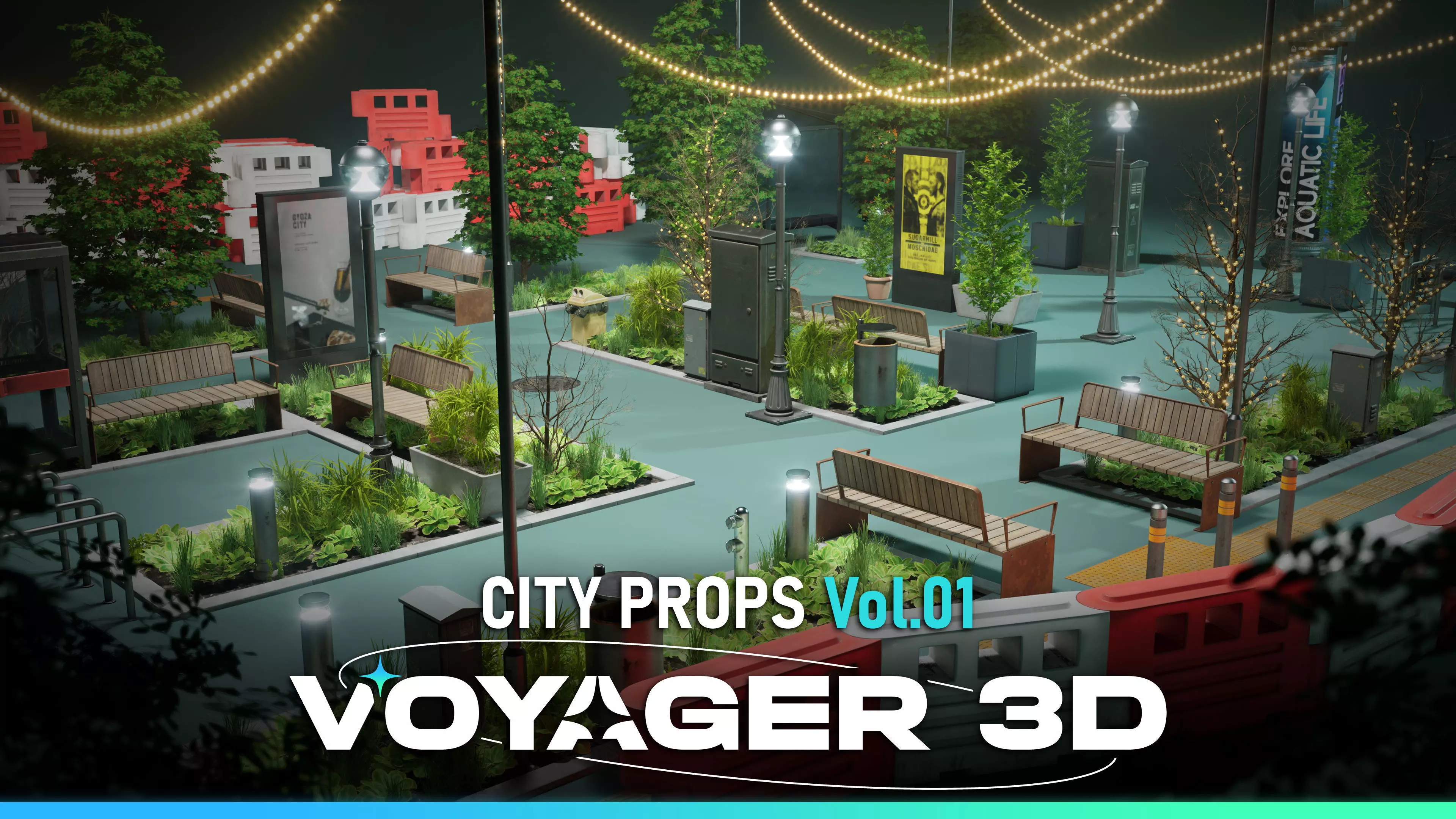 This props pack includes a collection of detailed meshes and materials for populating city environments. It features a variety of objects including street lights, bins, phonebooth and electric boxes, bus stop, manhole cover, park bench and more.