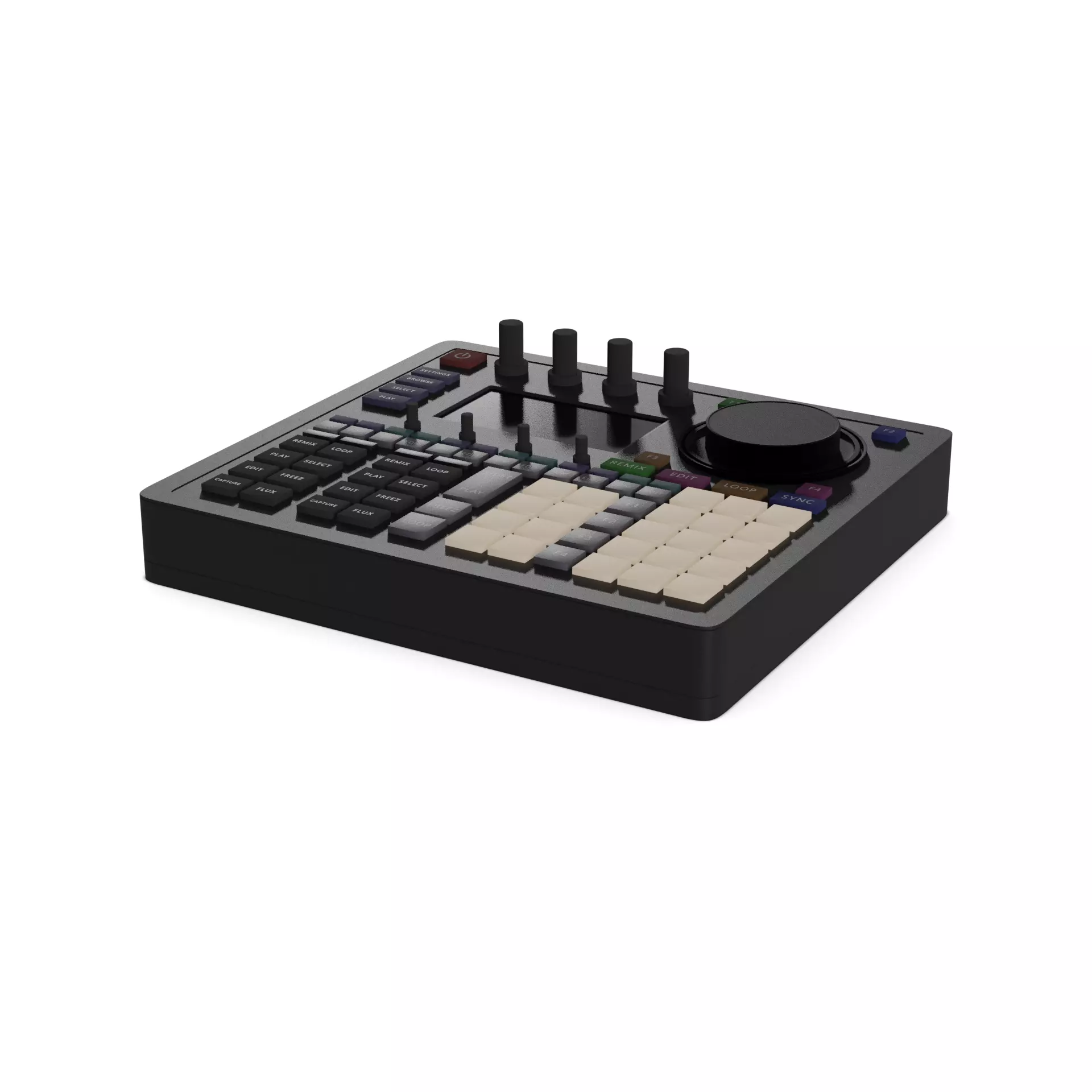 A sleek black DJ production sampler with a matte finish, featuring a grid of colorful backlit buttons for triggering samples, a bright LCD display for easy navigation, and a smooth touch-sensitive jog wheel for precise control, perfect for creating dynamic electronic music mixes in the current era of music production and DJing.