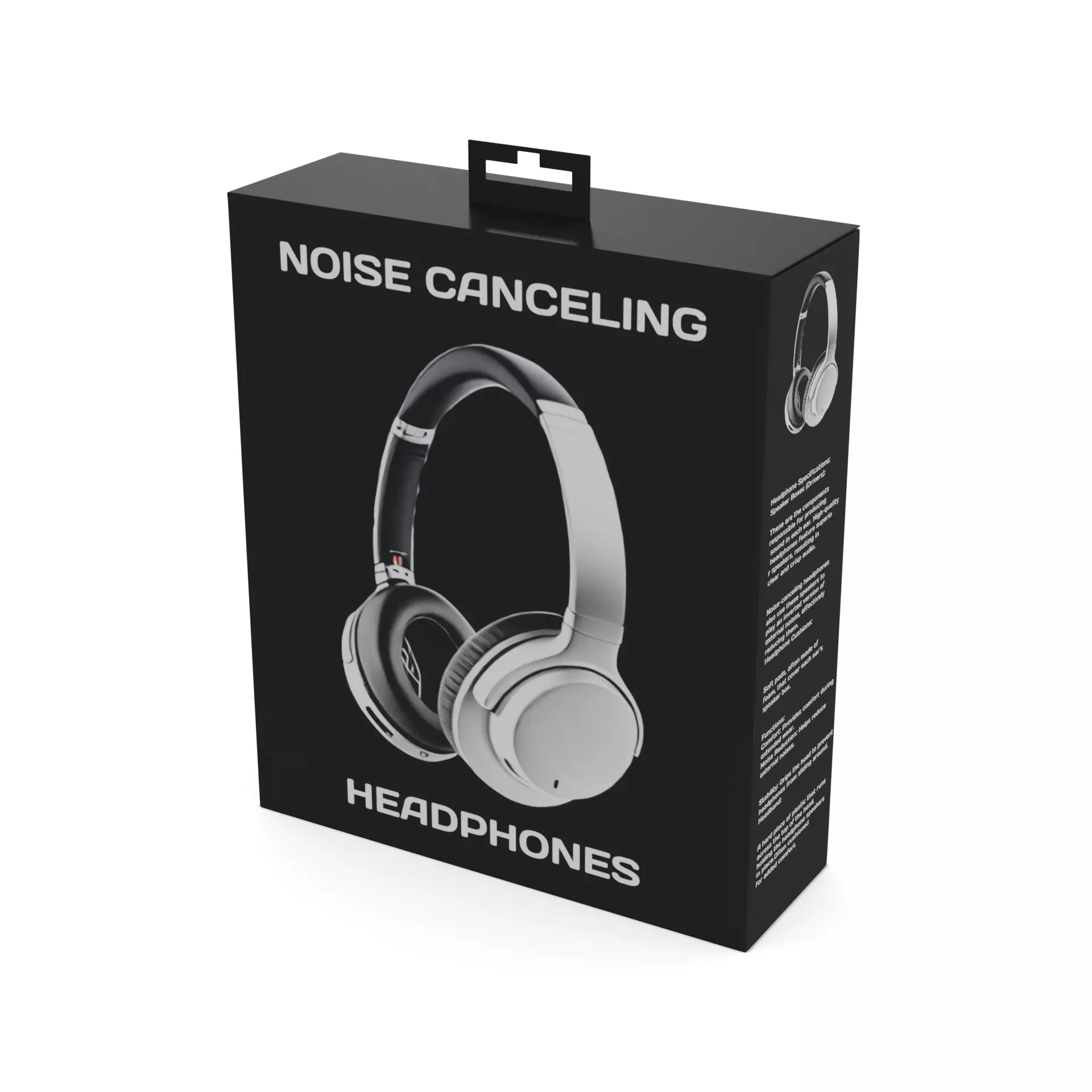 Noise-Canceling Headphones: A pair of over-ear headphones in a sleek black design. The packaging is a glossy black box with a picture of the headphones on the front. The label on the packaging highlights the headphones' noise-canceling feature and long battery life.