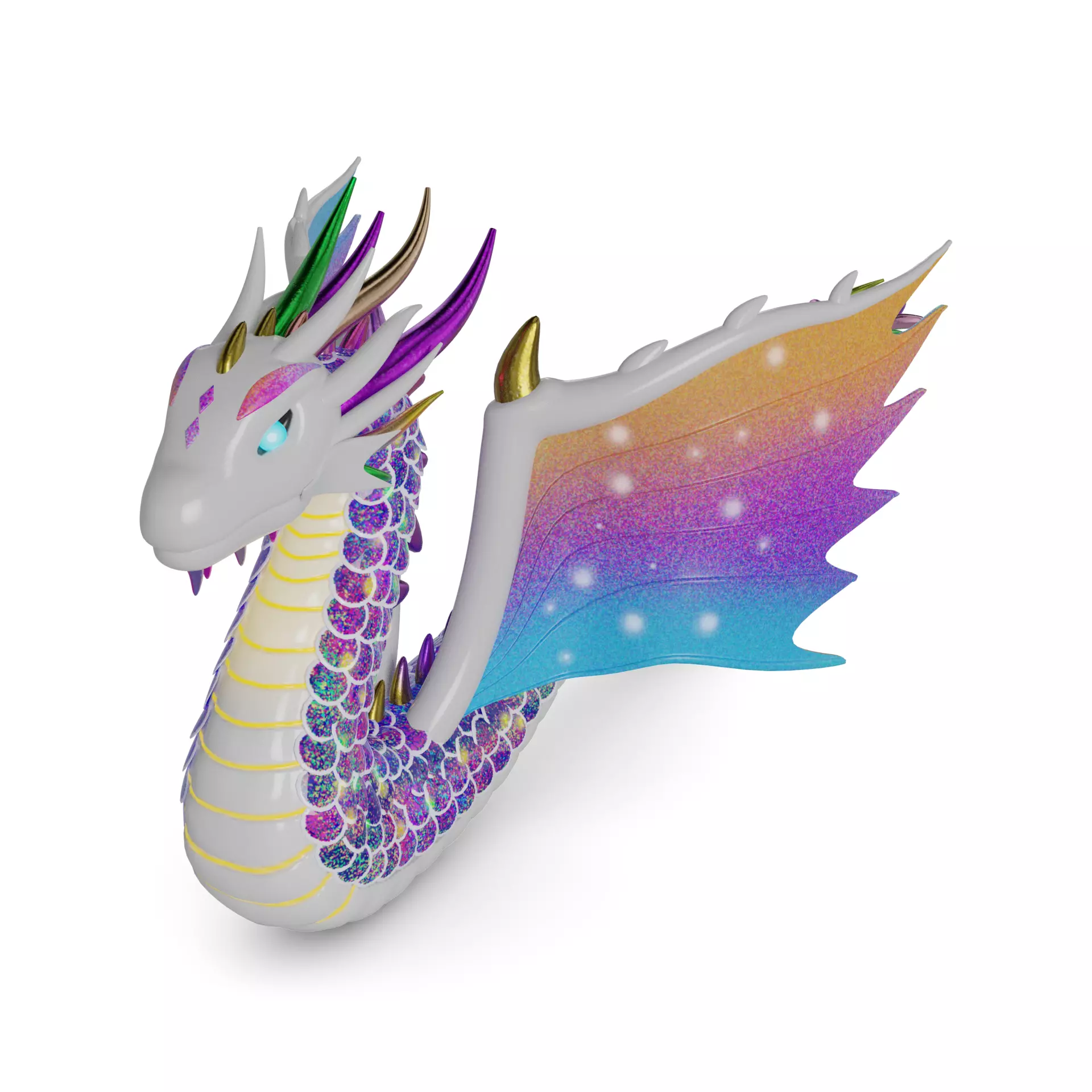 An electronic pet shaped like a vibrant rainbow-colored dragon, featuring iridescent scales and glowing LED eyes that light up in different colors. The dragon pet breathes out misty puffs of smoke and emits gentle roars, creating a magical and mystical experience for its owner.