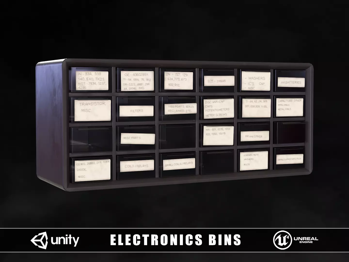 Electronics Bins 3D model. This model comes with the bins and 2 texture sets. Modeled in Maya and textured with Substance Painter and Photoshop. The model is built to scale and is UV unwrapped with 4k textures. Includes 3D model and textures!