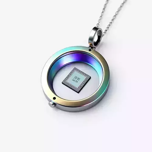 This meticulously crafted 3D model presents a futuristic pendant necklace, elegantly designed to feature an embedded microchip within a sleek, circular frame. The inner rim of the pendant boasts a captivating iridescent finish, creating a striking visual effect that shifts colors with the light, while a polished silver chain completes the sophisticated look. This unique accessory perfectly blends cutting-edge technology with contemporary fashion, making it an ideal asset for a variety of digital projects. It can be seamlessly integrated into sci-fi game environments as a collectible or character prop, used in cinematic renders for futuristic storytelling, or serve as a unique element in augmented reality (AR) and virtual reality (VR) experiences. Additionally, it's suitable for detailed product visualizations and digital art compositions. The model is optimized for both real-time applications, ensuring smooth performance in interactive scenes, and high-quality static renderings. It features clean, optimized topology, ensuring ease of modification and excellent performance. The model is fully UV unwrapped and includes high-resolution PBR textures to achieve its realistic metallic and iridescent appearance. It is available in popular 3D formats such as GLB, OBJ, STL, ABC, DAE, FBX, USD, and PLY, ensuring broad compatibility across various 3D software and engines.