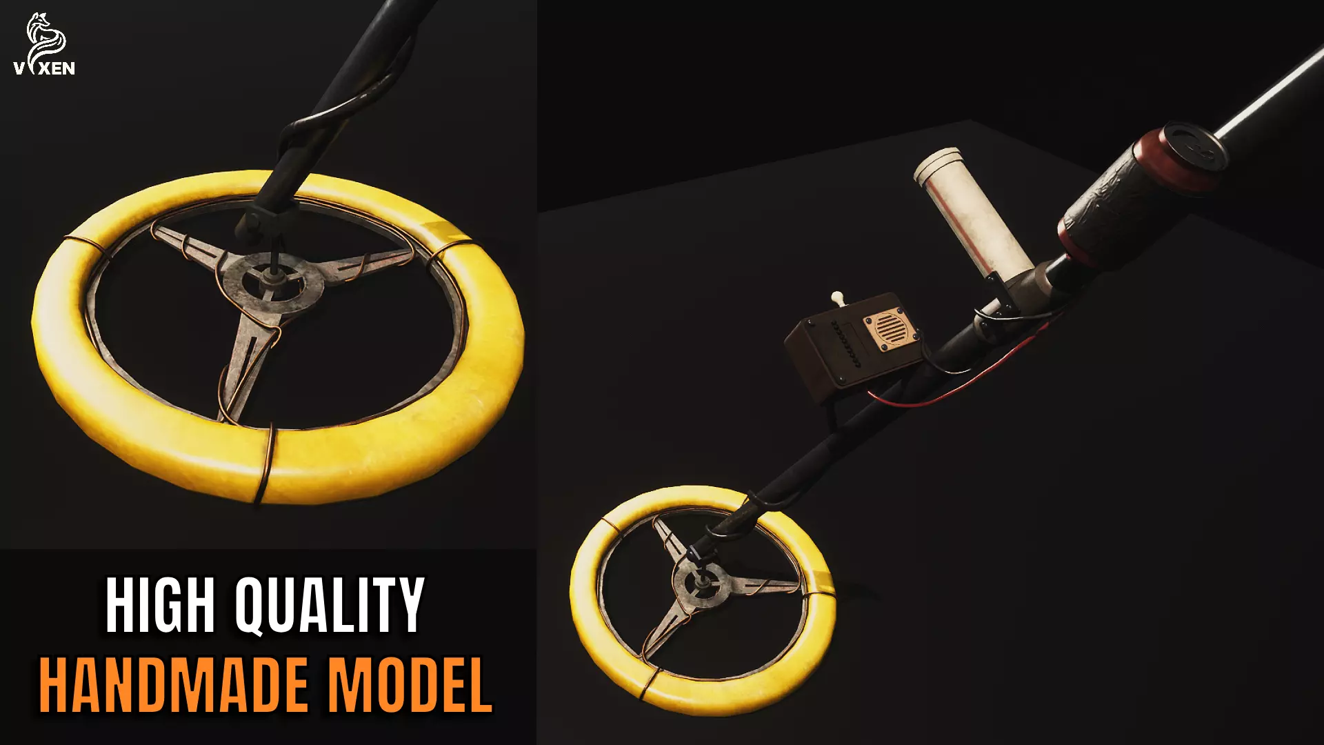 High-quality detector prop model designed for use in games, simulations.The asset features a rugged, industrial design with detailed components such as a circular detection coil, control box with LED indicators, cables, and worn materials—ideal for survival, exploration, sci-fi, post-apocalyptic, or underground gameplay scenarios.
