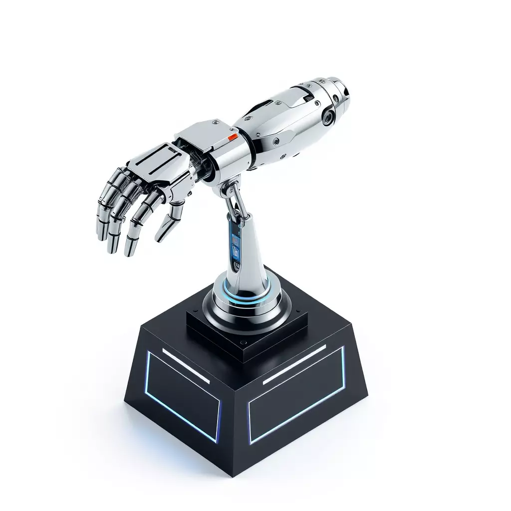 Presenting a meticulously crafted 3D model of a futuristic robotic arm, elegantly displayed on a sleek, high-tech stand. This model features a highly detailed, chrome-plated finish that reflects light with stunning realism, complemented by subtle illuminated accents on both the arm and its display base, enhancing its modern, sophisticated appeal. It is an ideal asset for a wide range of applications, from integrating into cutting-edge game environments and immersive AR/VR experiences to serving as a striking focal point in architectural visualizations of advanced laboratories or futuristic interiors. Digital artists and concept designers will find this model invaluable for creating captivating sci-fi scenes or industrial design renders. The model boasts clean, optimized topology, making it suitable for both real-time applications and high-fidelity static renders. It is fully UV unwrapped and comes with PBR textures to ensure a consistent and realistic look across various rendering engines. The geometry is ready for subdivision if even higher levels of detail are required. Supported file formats include GLB, OBJ, STL (for 3D printing of parts), ABC, DAE, FBX, USD, and PLY, ensuring broad compatibility with most 3D software workflows. This asset is designed for creators seeking a professional, high-quality representation of advanced robotics.