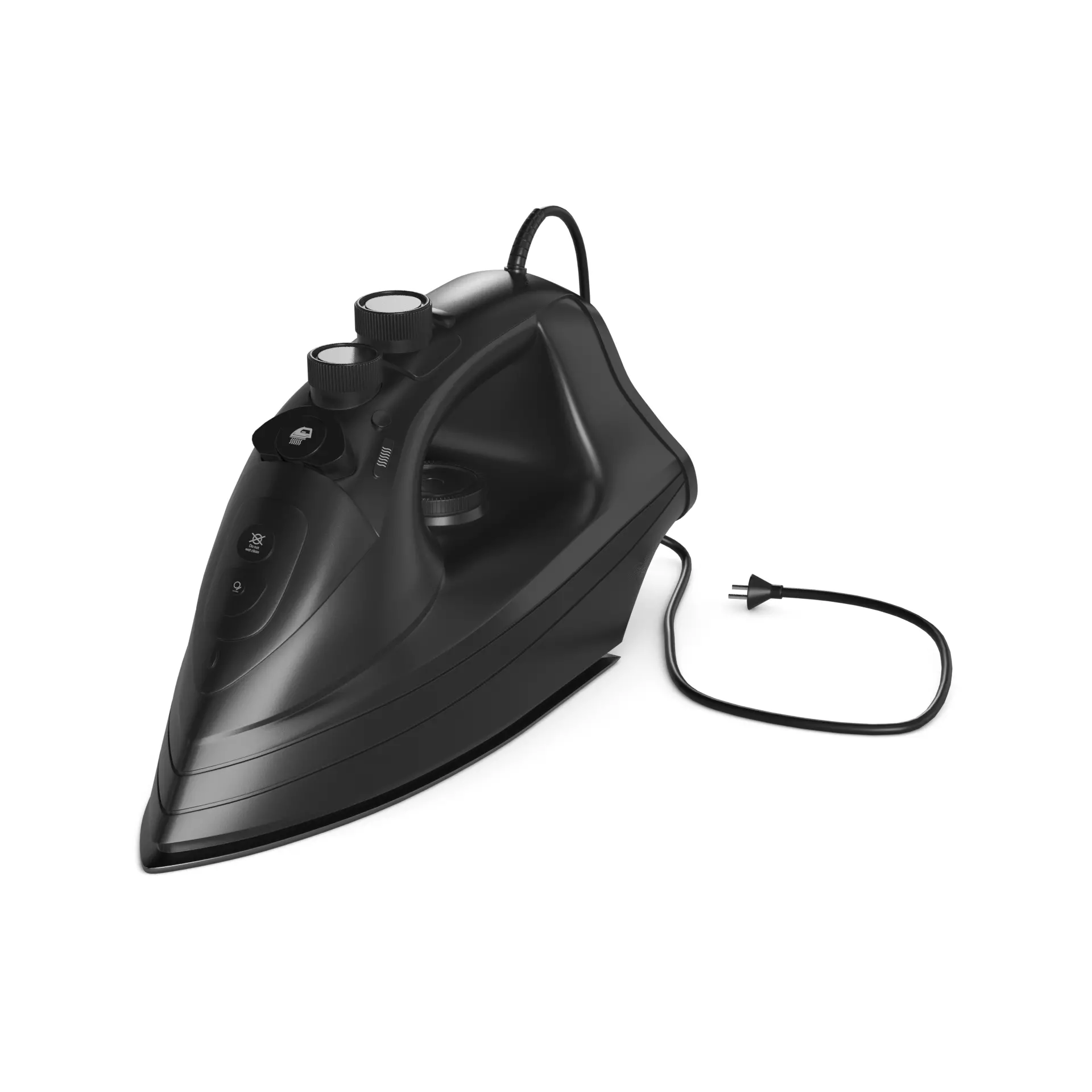 A stylish matte black iron with a retractable water tank and anti-drip system, offering convenience and efficiency for daily ironing needs in today's world.