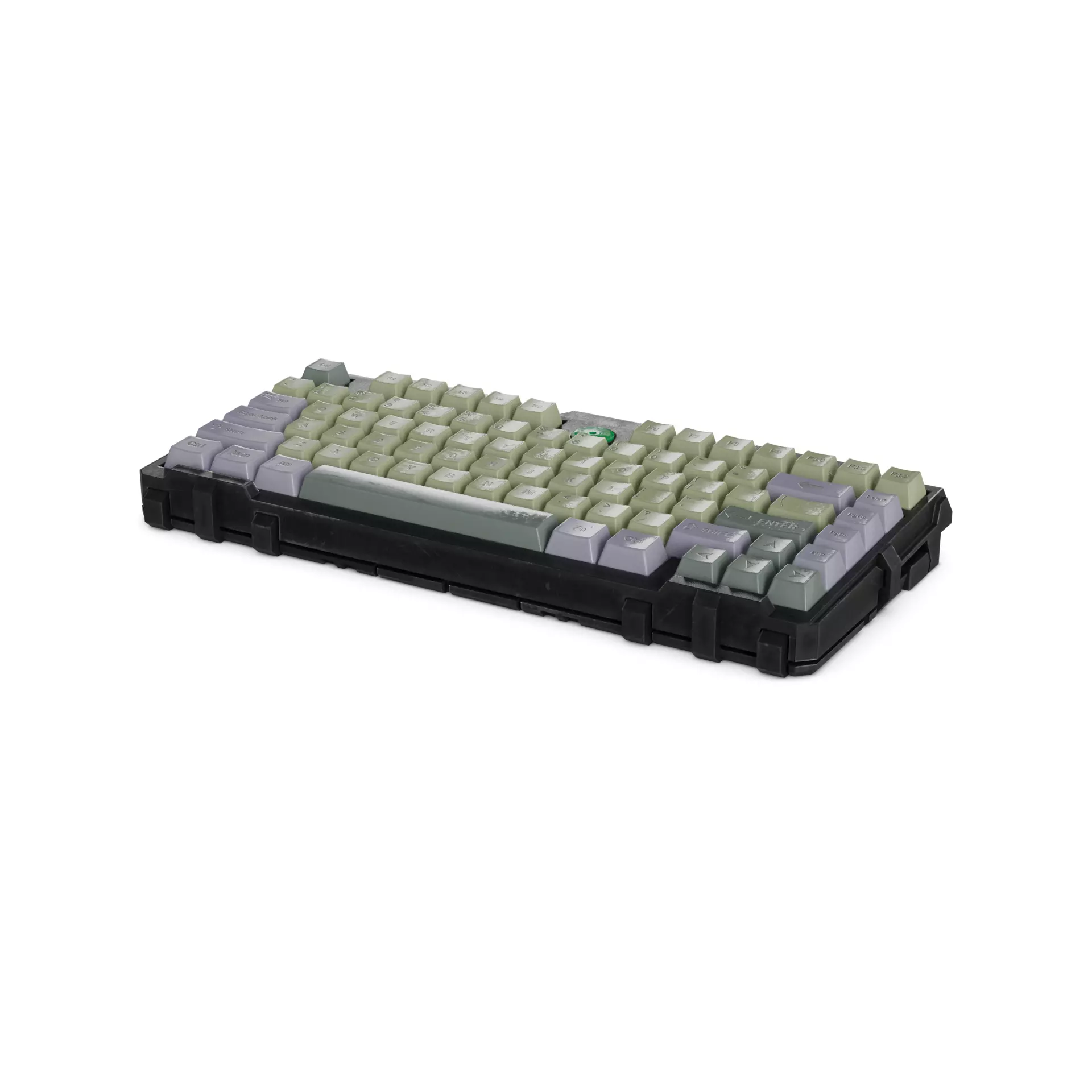 A rugged industrial-style keyboard with a weathered metal finish and chunky mechanical keys, designed for durability and performance in modern gaming environments.