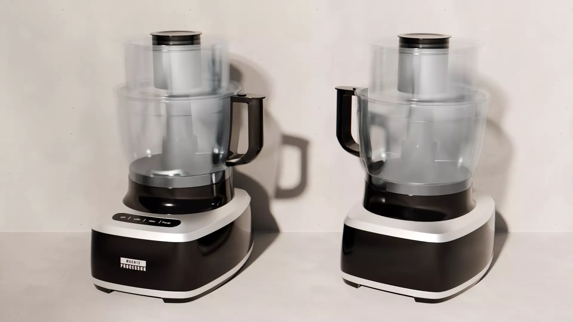 Food Processor: A versatile food processor in a sleek black and silver design. The food processor comes with various attachments, including a chopping blade, a slicing disc, and a shredding disc. The packaging is a cardboard box with a picture of the food processor on the front and a label indicating the capacity of the bowl and the power wattage.