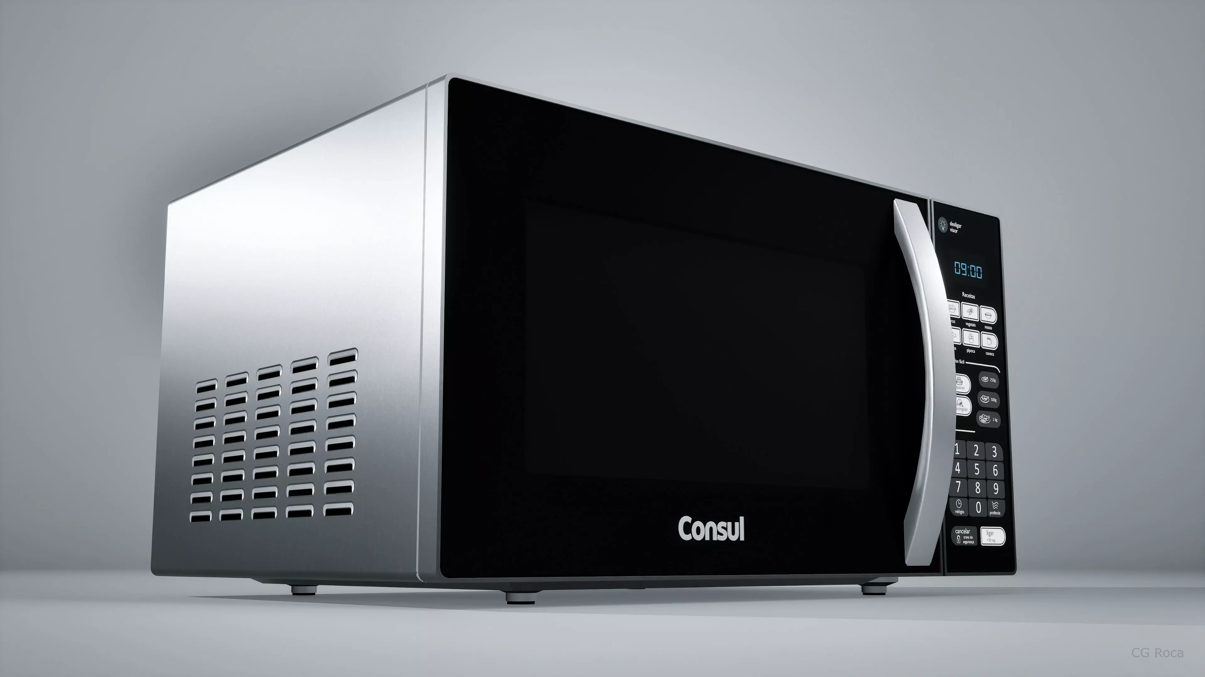 This microwave was created with clean topology and an efficient polygon count — built without excessive polygons. The display control panel was carefully designed manually in GIMP, in both Portuguese and English, based on real photos, providing a high level of realism and attention to detail. The model is optimized for performance, ensuring smooth use in both real-time applications and high-quality renders.