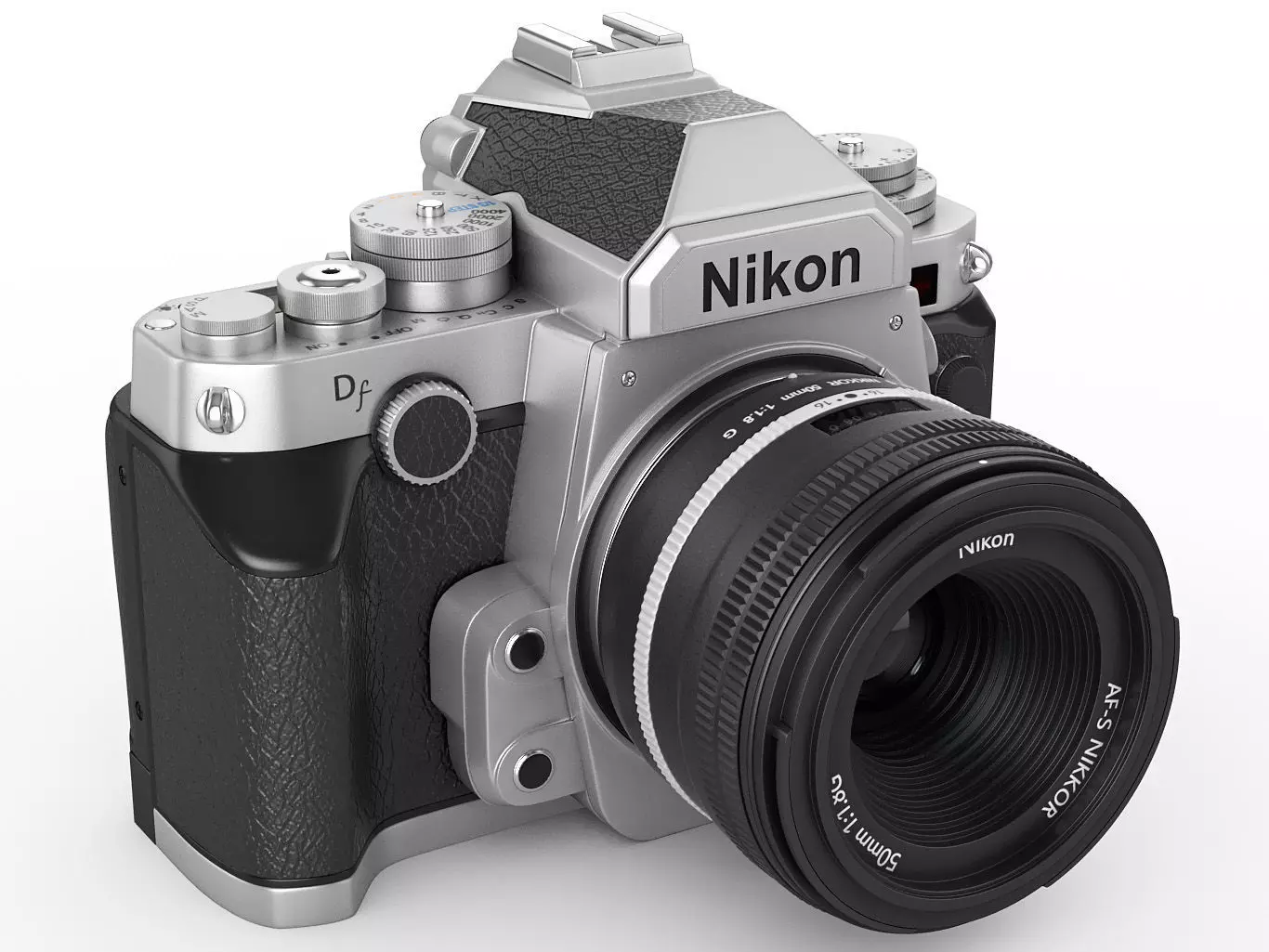 Detailed and textured model of Nikon DF digidal camera with Nikkor lens.