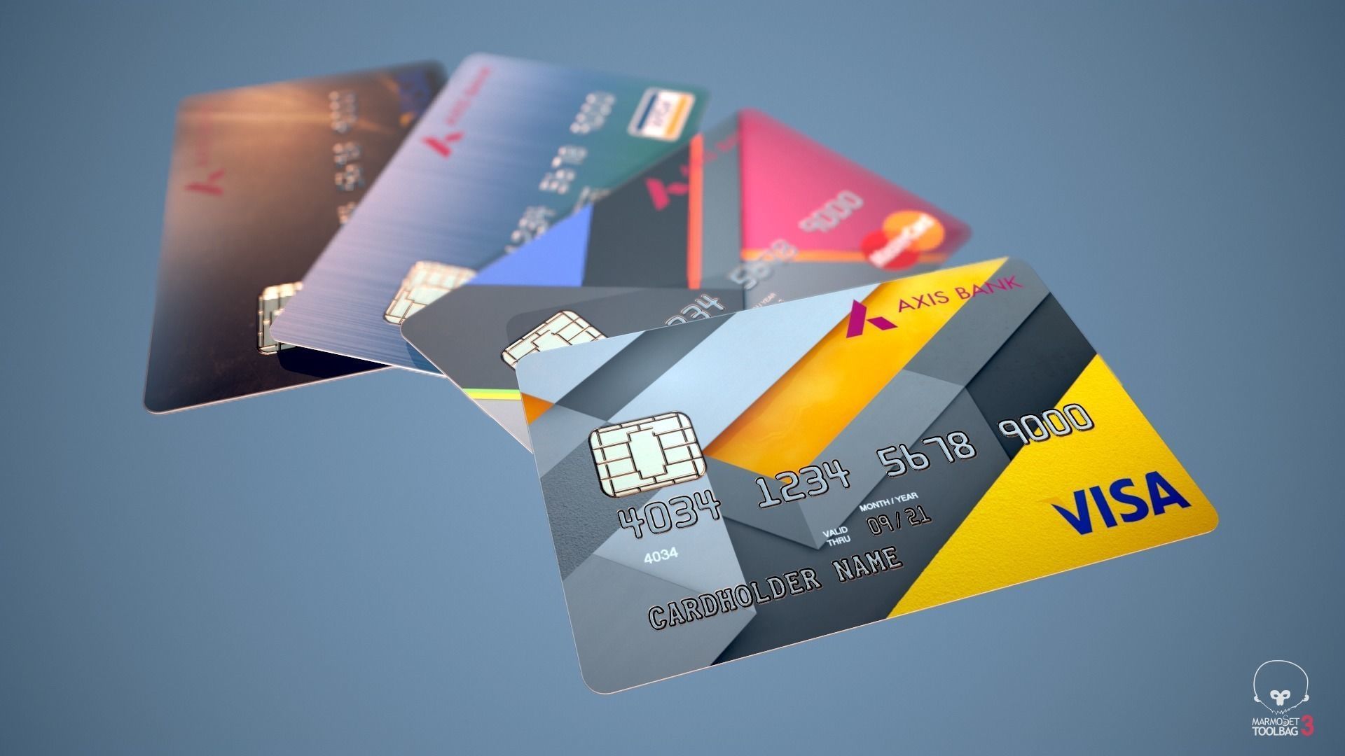 There are 7 different credit card background textures with different information and card type (MasterCard & Visa). = 105 textures.PSD file is included so you can easily create your custom background texture.