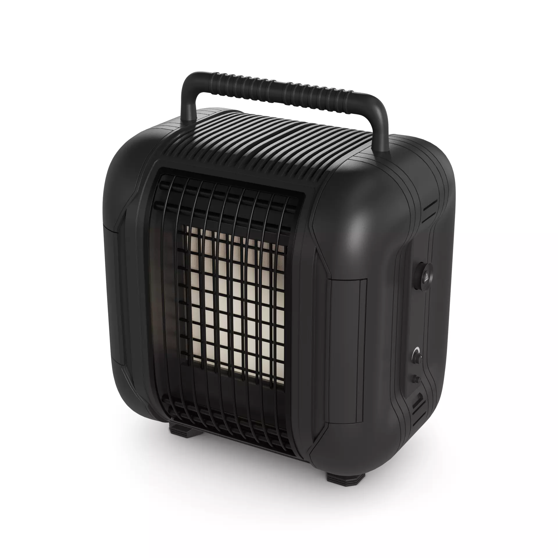 A portable heater in a matte black finish, designed for outdoor use in the current timeline, with a durable construction to withstand various weather conditions.
