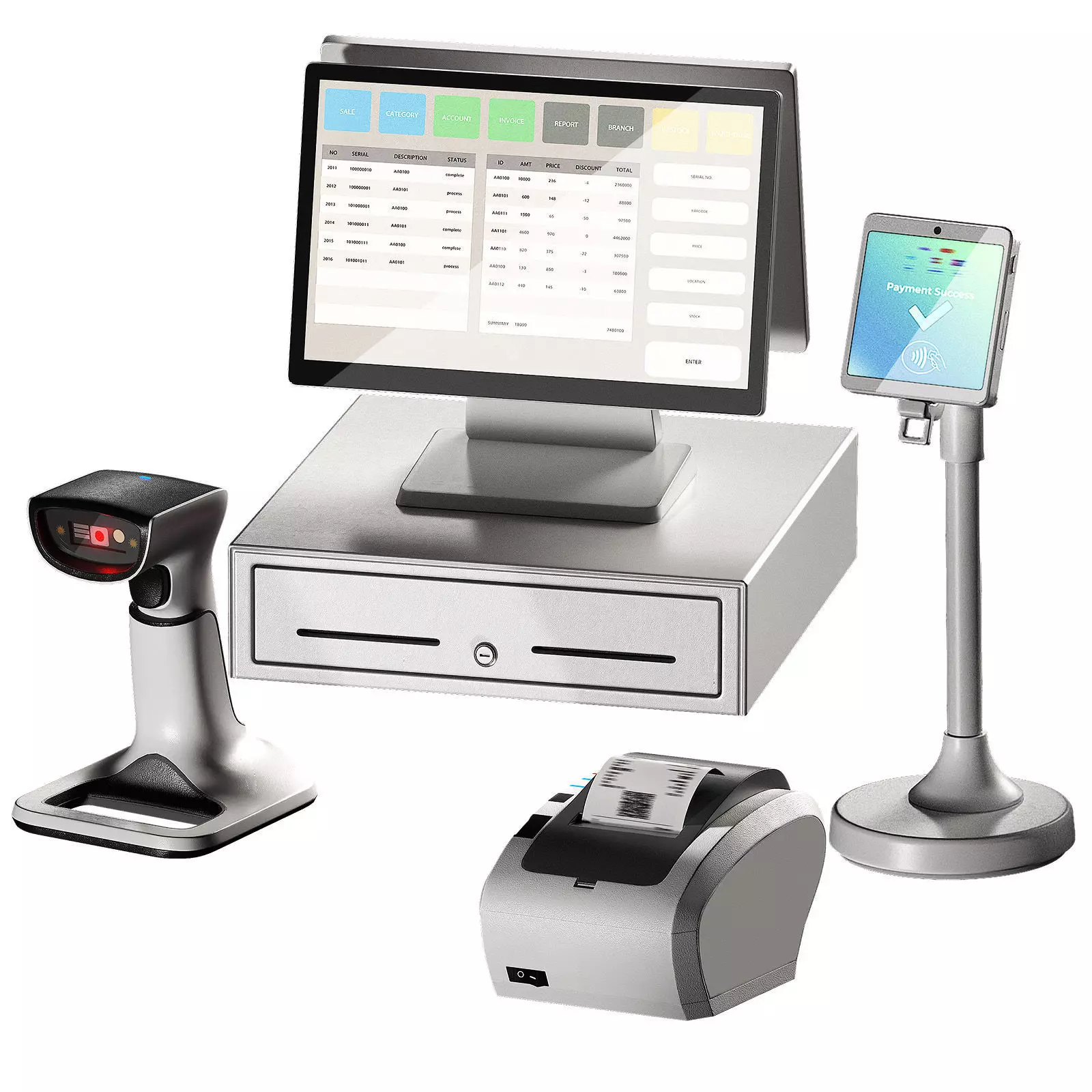 The 3D model contains a set of cash register equipment in white and black. Pos terminal for non-cash payment, cash register area, receipt printer, fiscal registrar, barcode scanner.