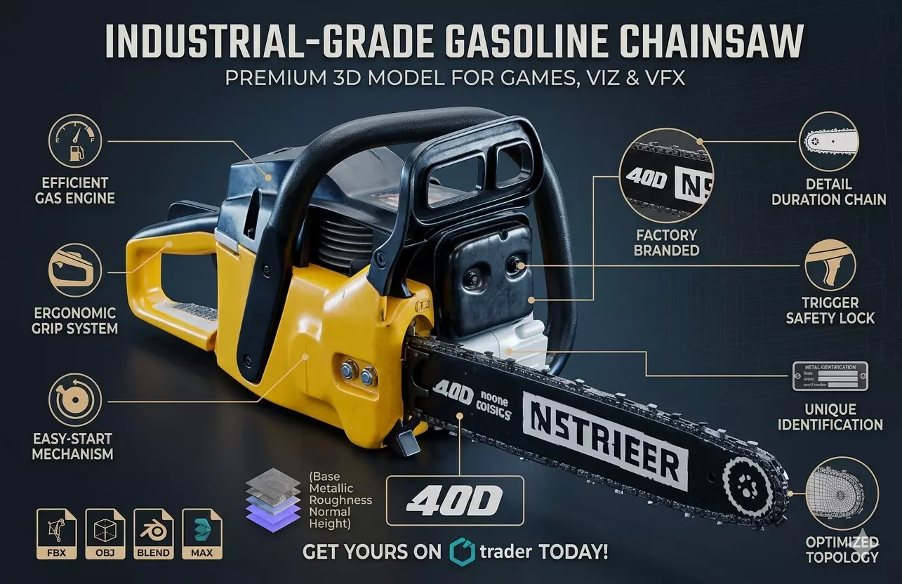 This is a high-quality, realistic Gasoline Chainsaw model, designed for industrial visualizations, survival games, and workshop environments. The model features professional PBR textures and a balanced polygon count, making it ideal for both cinematic renders and real-time engines.