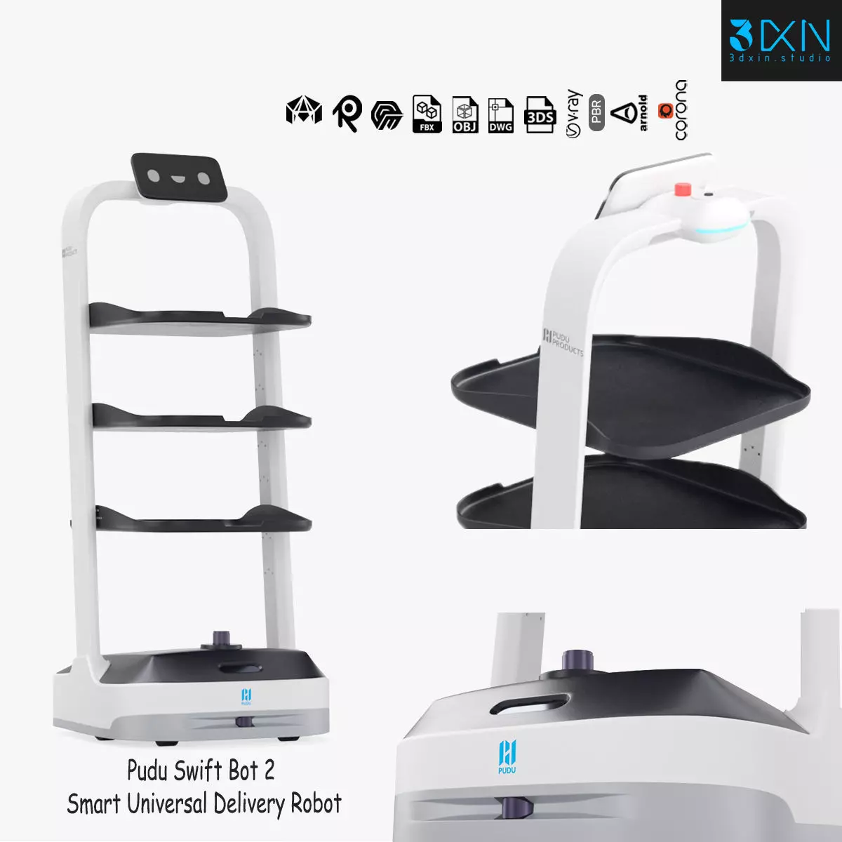 Pudu Swift Bot 2 Smart Universal Delivery Robot is a high quality, photo realistic 3d model that will enhance detail and realism to any of your rendering projects. The model has a fully textured, detailed design that allows for close-up renders, and was modeled in 3ds Max 2018 also has 3ds Max 2015 version and rendered with V-Ray. Renders have no post-processing.