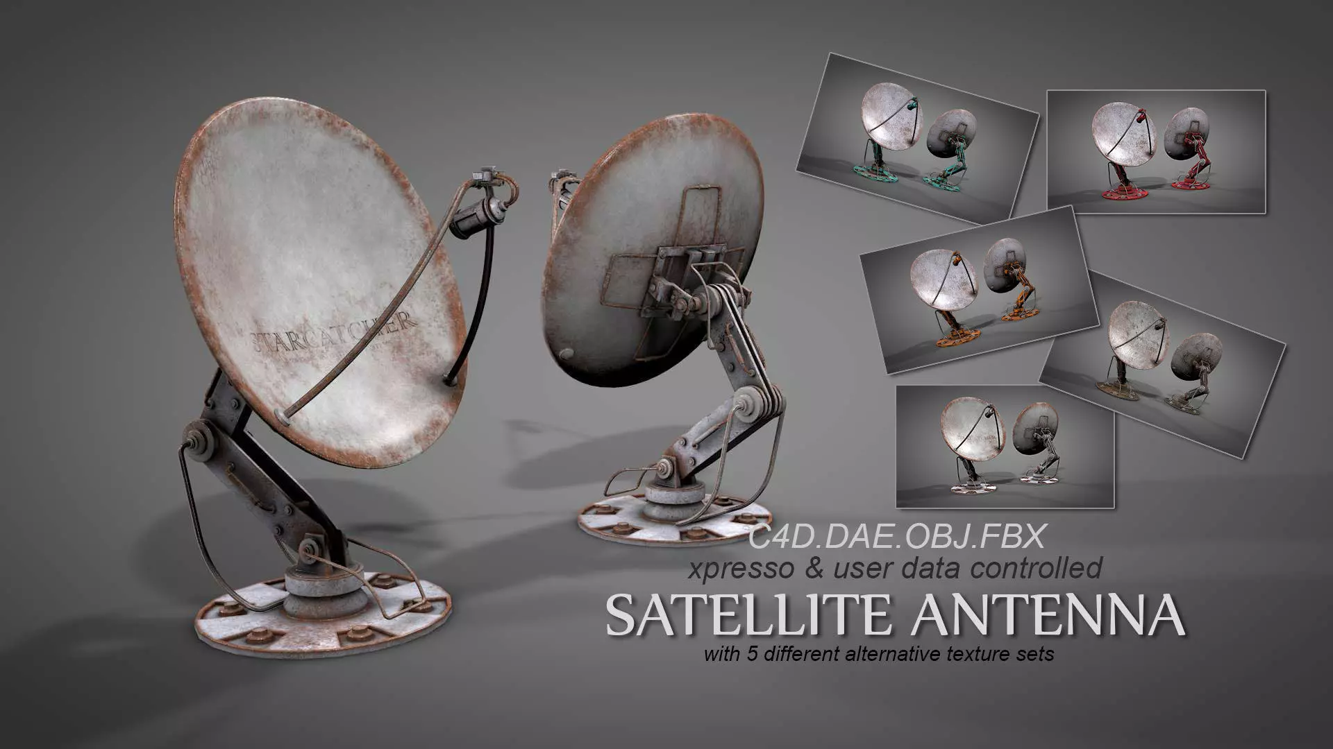 antenna(SP).C4D has baked textures. This format needs TEX folder for materials. User Data & Xpresso available.