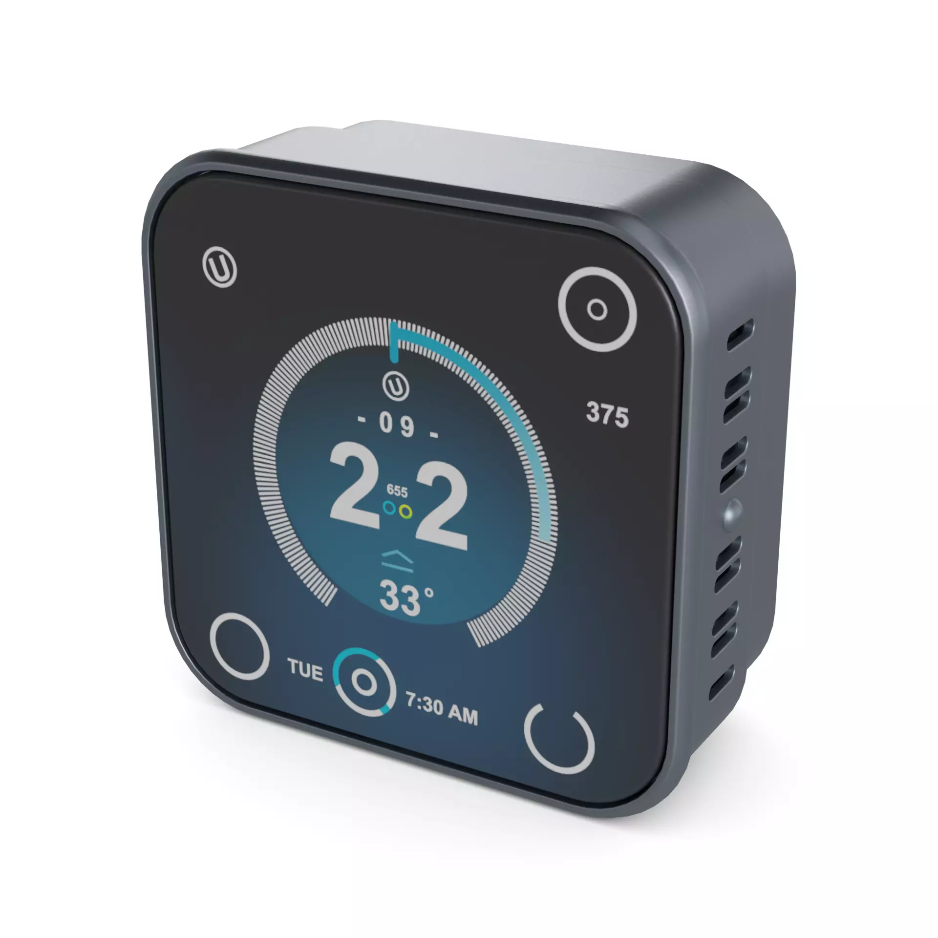 A high-tech smart thermostat with a digital touch screen and energy usage tracking, perfect for maintaining a comfortable work environment while reducing costs in a modern workplace.