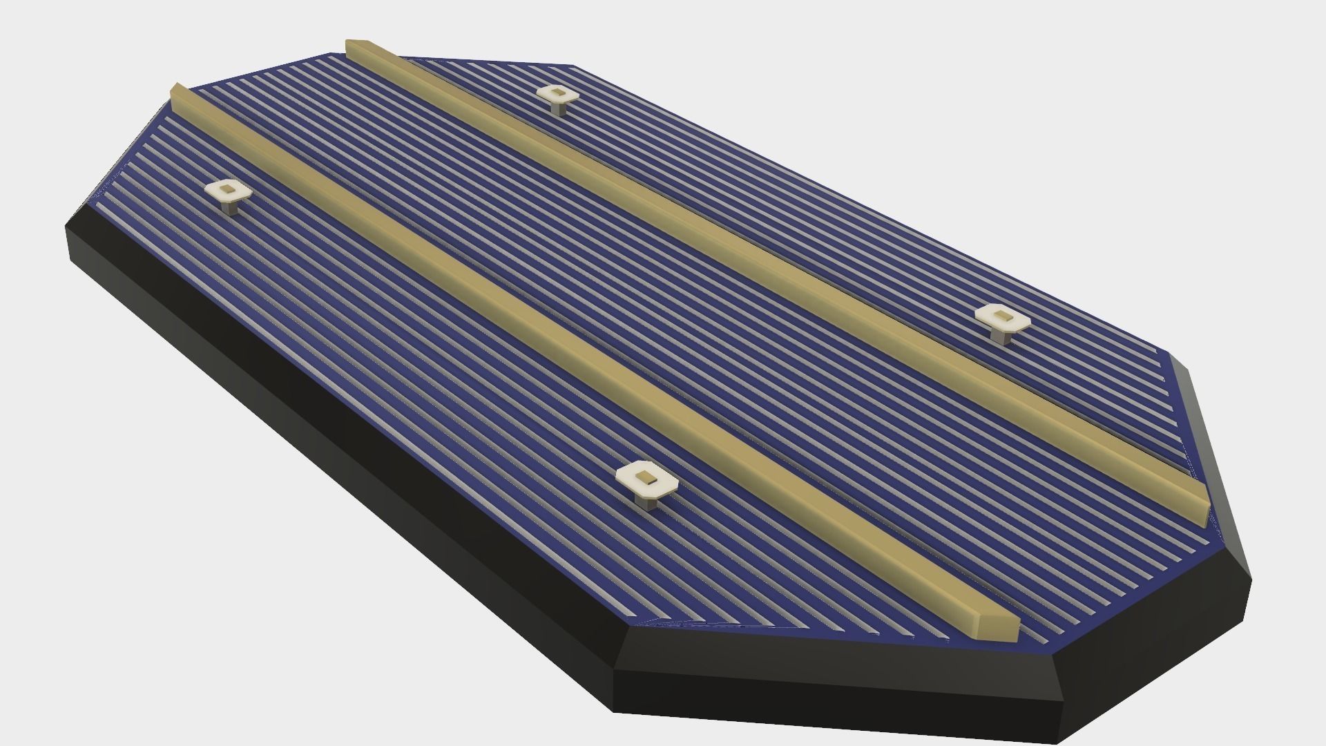 This is a model of a single photovoltaic cell. The dimensions of this standard sized cell are 6 cm x 3 cm x 0.40 cm. This cell can be used to populate solar modules and arrays. The cell itself is crystalline silicone, with gold busbars, embossed on a black silicon wafer. Smaller electrical contacts (fingers) are in an array of conduits along the long axis of the cell. It has a total light collecting area of 9.335 cm^2.