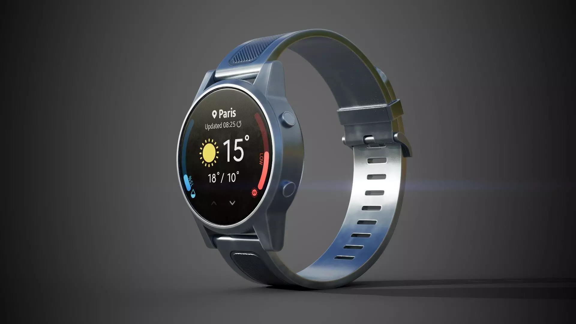 High-quality, realistic smartwatch created for real-time environments and product visualization. Featuring a sleek round display with a detailed weather interface, this model presents temperature, location, and forecast information in a clean and modern layout. The smooth grey silicone strap, refined casing, and subtle side buttons add to its authentic and contemporary appearance.