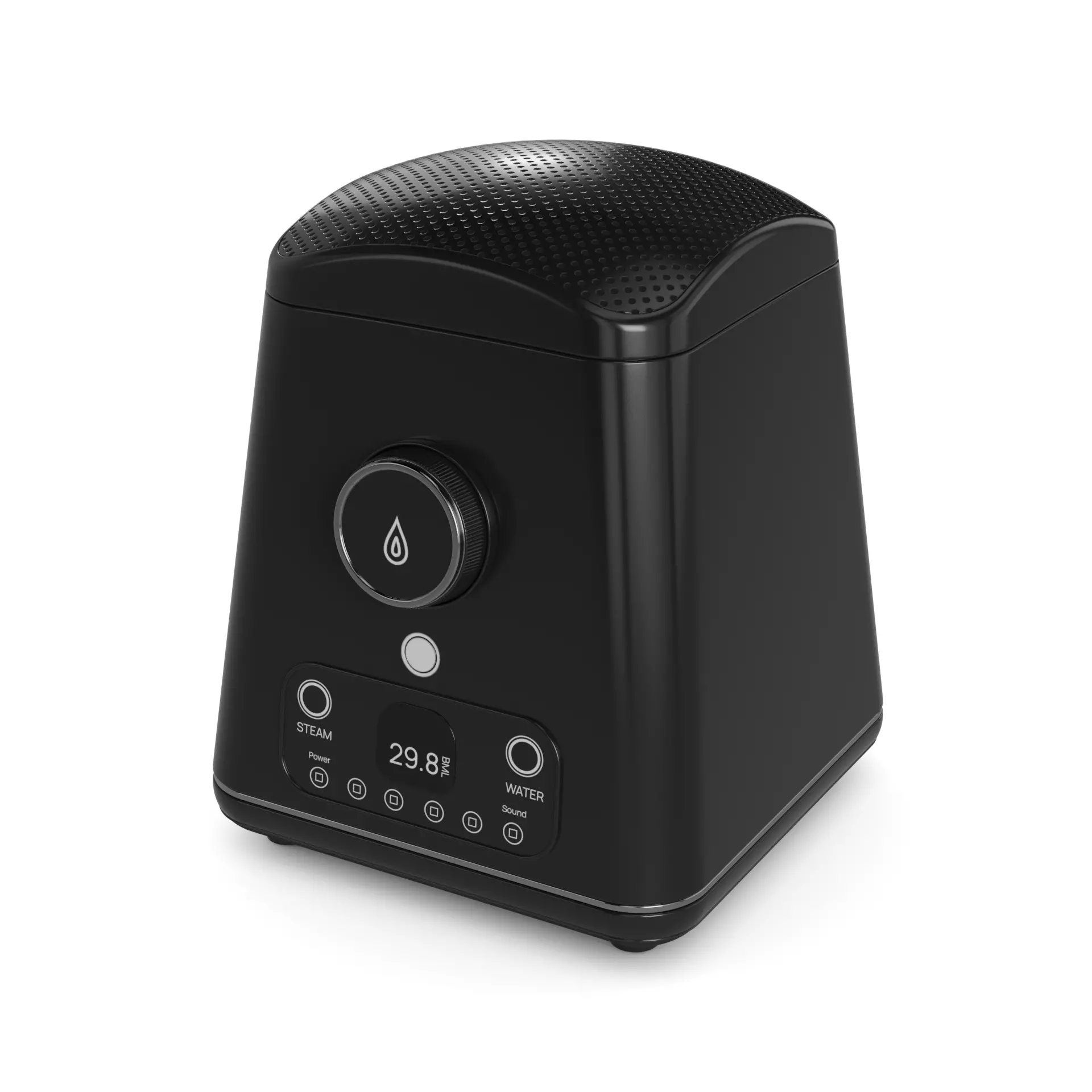 A sleek black steam station with a glossy finish, featuring a digital display and multiple steam settings, perfect for tackling even the toughest wrinkles in your clothes.