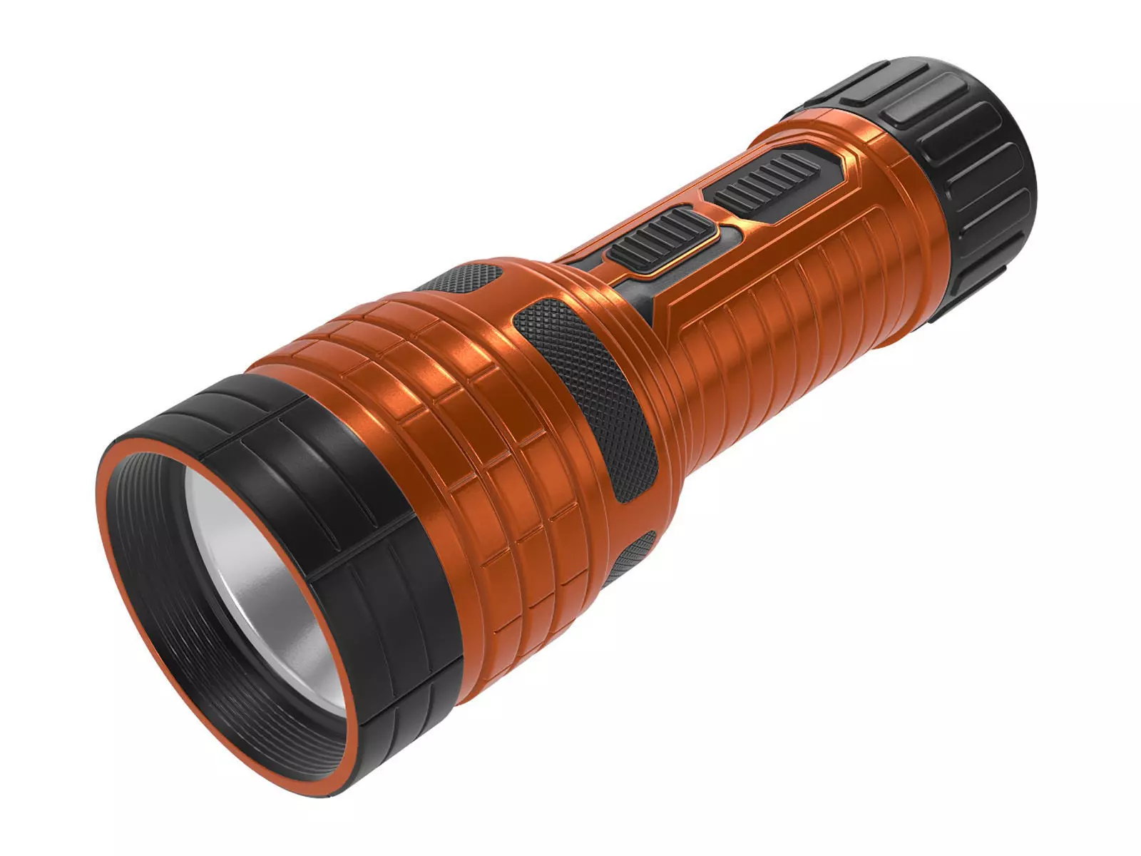 A rugged orange underwater flashlight with a non-slip grip, built to withstand harsh underwater conditions and provide reliable lighting for underwater adventures in the current timeline.