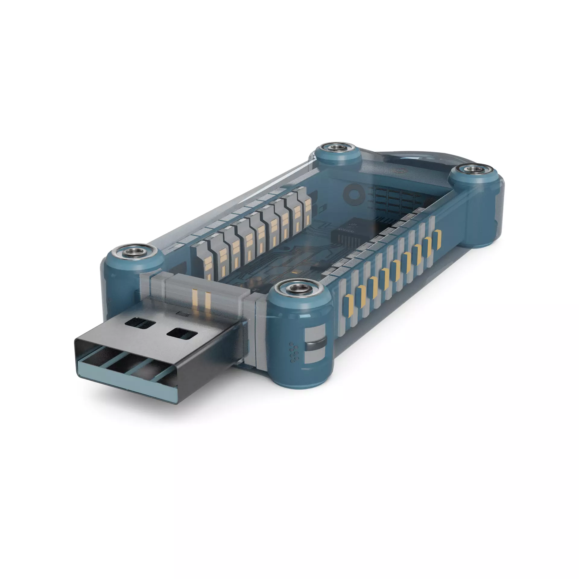 A transparent USB flash drive with LED lights that indicate data transfer, adding a touch of innovation to storage devices in the current timeline.